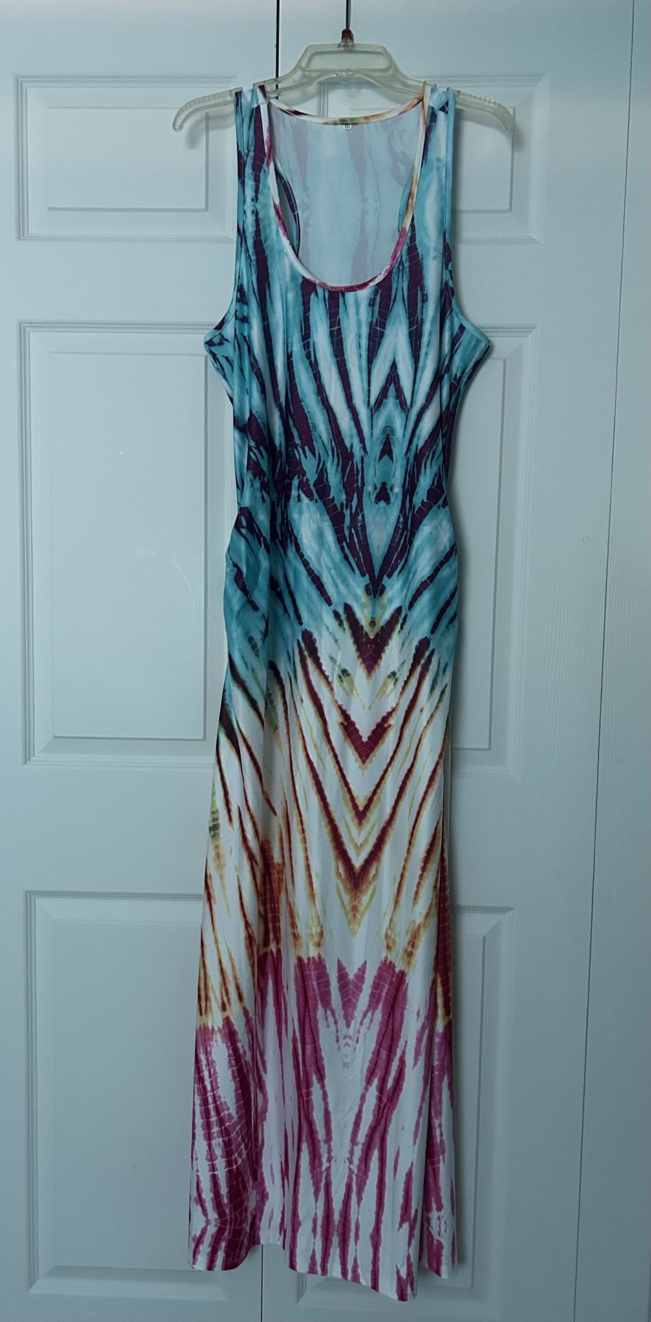 All size large $10 colorful dress new $6 gray romper (only one used) $7 each green and gold blouse- new $10 dress and navy blue open sided long blouse- new Into the night perfume and lotion $16 set- new/ un used