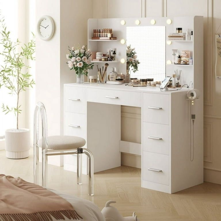 New Large Vanity Desk with LED Lighted Mirror & Power Outlet,Makeup Vanity Table with 7 Drawers,4 Shelves and 5 Hooks, Vanity Table, Vanity Desk Set for Bedroom,Bathroom, New in box VN23-0244 The dressing table is equipped with a large mirror, you can sit in front of the vanity to try different styles of clothes, draw delicate makeup, and there are 10 Hollywood style LED bulbs around the mirror, you can adjust the warm and cold tone and brightness, illuminate your beauty. Multiple drawers and open shelves as well as a hairdryer rack are big enough to hold your makeup, jewelry and other small items. It also comes with 2 standard sockets and 2 USB ports, perfect for using a hairdryer or charging your phone. * Plenty of Storage: Large table top with 7 Drawers and 6 open storage space, all of your makeup, hair and body products can fit and keeps them stored and safe. * Built-in Charging Station: This vanity table with 2 standard plug sockets and 2 USB ports, more convenient for curling iron, beauty device, hair dryer and phone charging. * Mirror with 3 Color Lighting Modes: The large mirror with 3 different color modes: warm yellow, warm white and cold white, can adjust the brightness according to different scenes and makeup needs. * Stylish and Functional Design: Our vanity desk is a perfect combination of vanity and jewelry armoire, there are lots of spaces for you store jewelry. New Makeup Vanity with Mirror and Drawers Vanity Desk Set with 3 Modes Adjustable Brightness Lights and USB Power Outlet