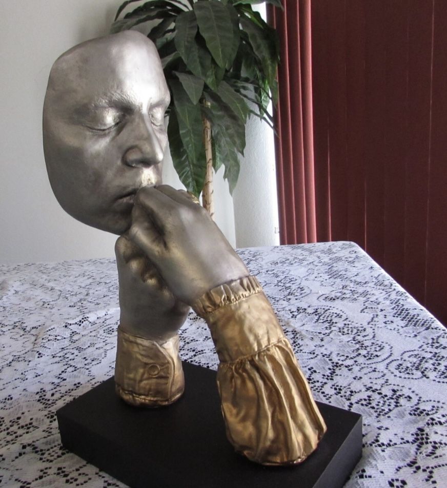 Selling my grandparents' antique collectibles that they no longer need for a fair price. You can resell these items on eBay for a great flip. stunning and beautiful John Cutrone mask of a man kissing ladies hand. Rare Austin Productions. Finished with a golden bronze paint. Detail of the skin, eyebrows and fingers is realistic. Elevate your space with the Enchante John Cutrone Sculpture, a testament to the allure of vintage art. Crafted in 1996 by the renowned Austin Productions, this medium-sized sculpture stands at 15 inches tall with a width of 10 inches, making it an ideal piece for an elegant table display. The modernist style sculpture captures the essence of figures in a gold-toned Durastone medium, exuding a timeless sophistication that complements any interior design theme. This original work, hailing from the US, reflects the artistic vision of Cutrone, notable for his sculptural art that resonated during the 1990s. While it is not signed, its authenticity as a multi-piece work from this era is undeniable, making it a discovery for collectors and art enthusiasts alike who appreciate the unique blend of culture and artistry. $60 OBO