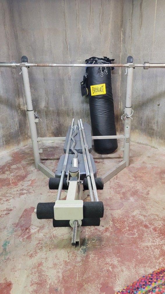 Bench press SOLD, 5 Olipmic Bars (including 7' value at $100) and 80 lbs large puncing bag with bracket to hung.