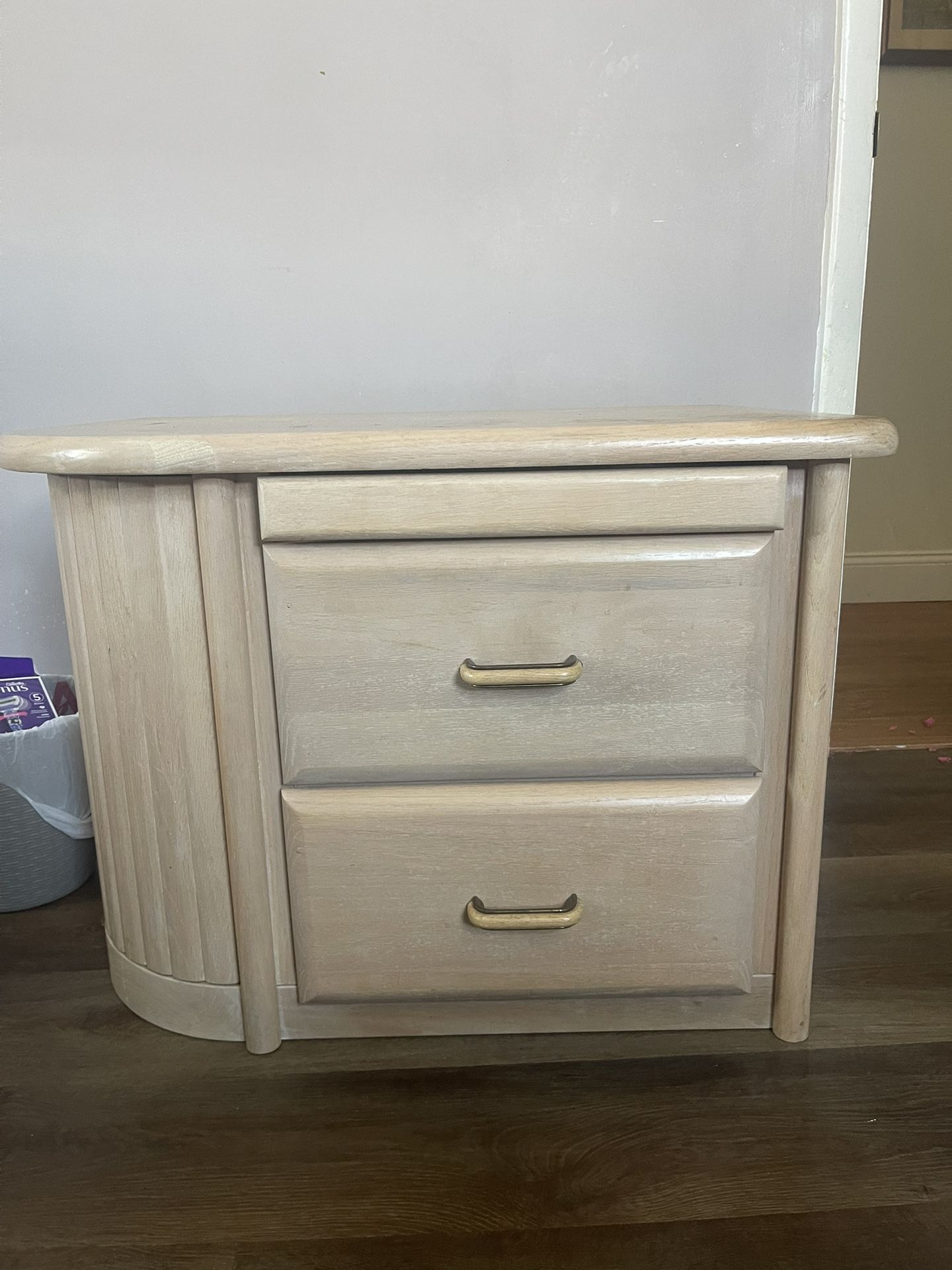 A matching pair of sturdy vintage nightstands with a light wood finish and gold-tone handles. Each piece features two spacious drawers and a unique rounded side design for added style. The wood has a slightly whitewashed look, giving it a soft, neutral tone that fits with many décor styles. Both nightstands are in good functional condition with minor wear from normal use. Perfect for bedroom storage or as stylish accent tables.
