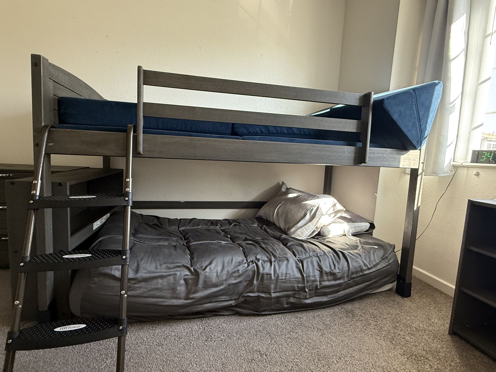 Mattress and nugget not included Twin size loft bed with space underneath. Comes with one dresser, one night stand and an open book shelf. Night stand is 29.5Lx15”Wx27”H Dresser 30”Lx15”Wx26.5”H Bookcase: 36”Lx10”Wx26.5”H Used good condition. Pictured are some Flaws as it is used. Cash only no trades Must be able to pick up
