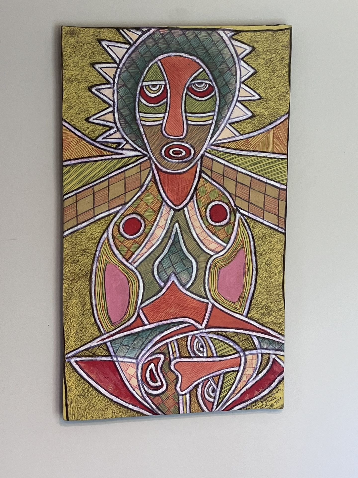 Kayode Buraimoh (Nigerian, 20th/21st century) Untitled, 2013 Acrylic and ink on stretch cloth canvas Signed to the lower right The artist born in Nigeria, Kayode Buraimoh is best known for modernist depictions of figural compositions steeped in traditional African folk art motifs, rendered in bold, clean pigments and irregular shapes. These bold and unique pieces of art are perfect for bringing color and culture to any space looking to get more creative! Dimensions 13.5W x 23.5" H x 1.0" D