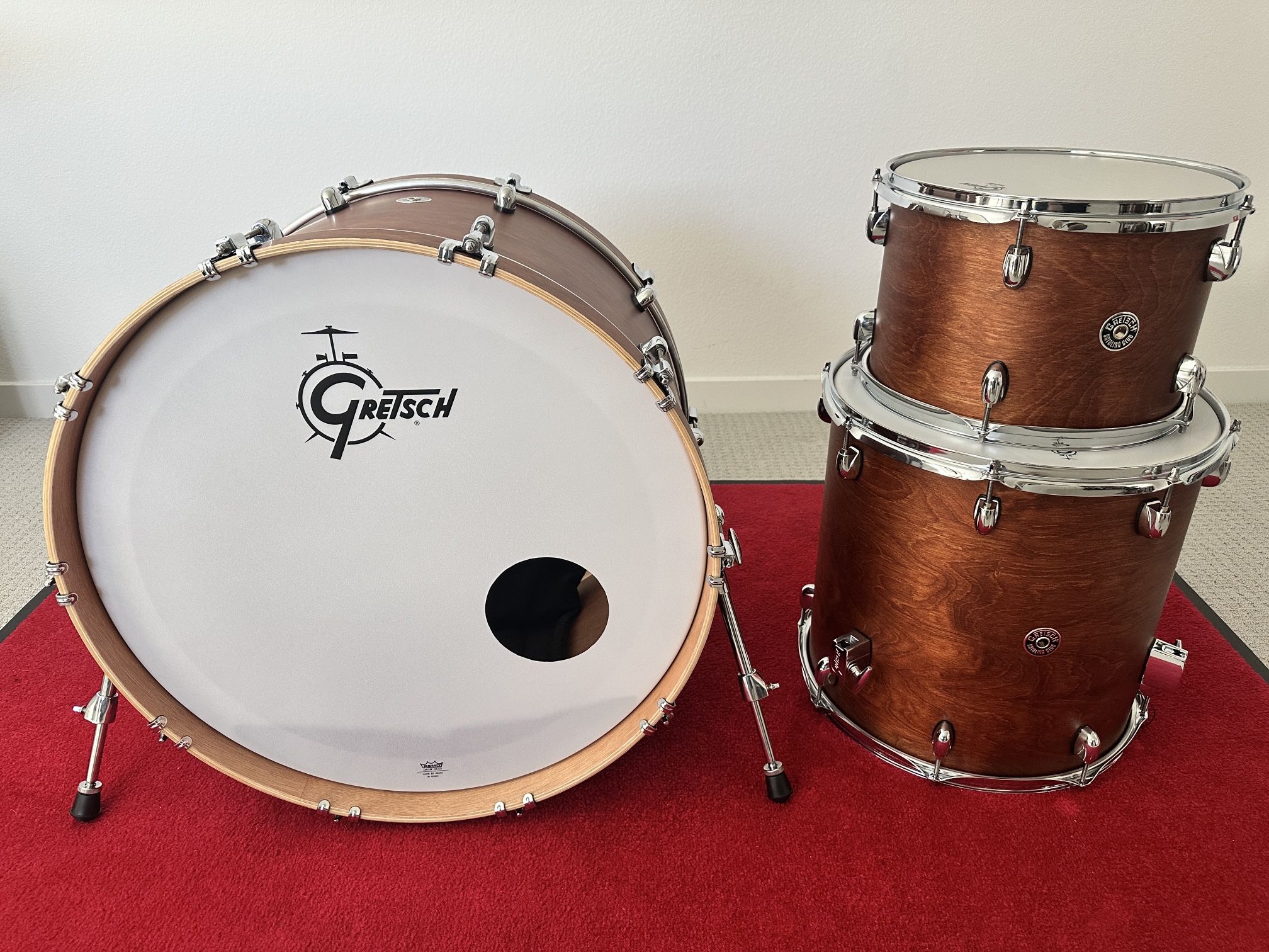 Up for sale is a Gretsch Catalina 3-piece kit in Rock sizes. It was purchased last year and has mostly sat in cases. Mahogany shells in an amber walnut finish: 13x9” rack tom 16x16” floor tom 24x14” kick drum No damage or scratches anywhere. The toms have the stock Remo heads, the kick has a clear Remo Powerstroke 3. Comes with the mounting bracket for the rack tom and legs for the floor tom.
