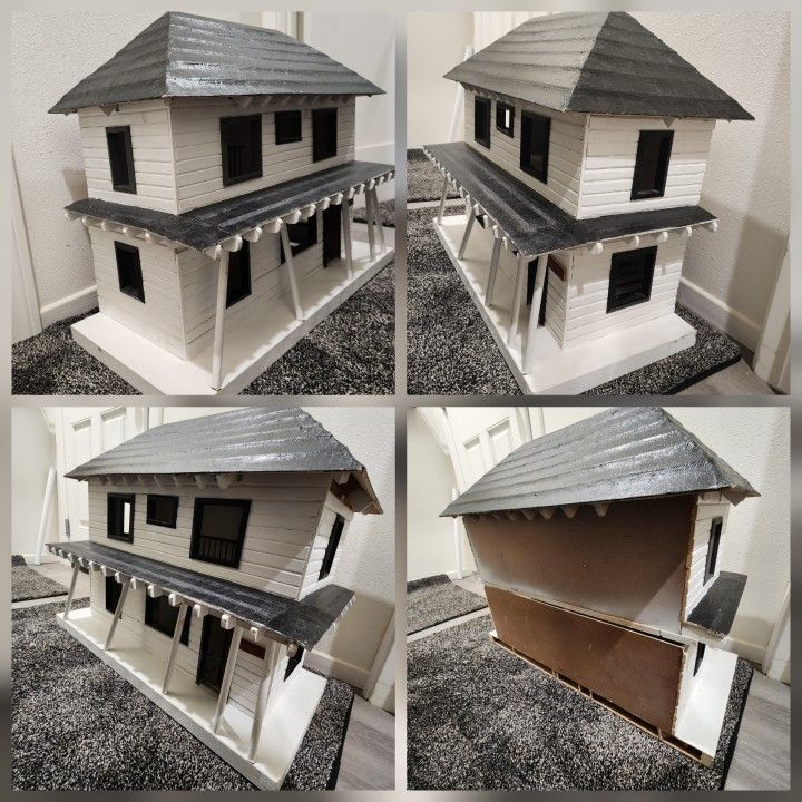 Has Wear & Tear! As Is Condition & Needs TLC! Must Pick Up! Cash Only! This handmade dollhouse comes apart in three seperate attachments to open up above access to rooms. A few toys are included, as pictured. Overall, the dollhouse is sturdy and detailed with great potential for further DIY enhancments. Total Approximate Dimensions: 27x14x25in Has spotting in some areas, otherwise primary color is white with black and beige accents. It also has tile on first level of the home. Some areas may require smoothing. The front pegs are secured in place but reinforcement may be desirable due to some raising and wobbling.