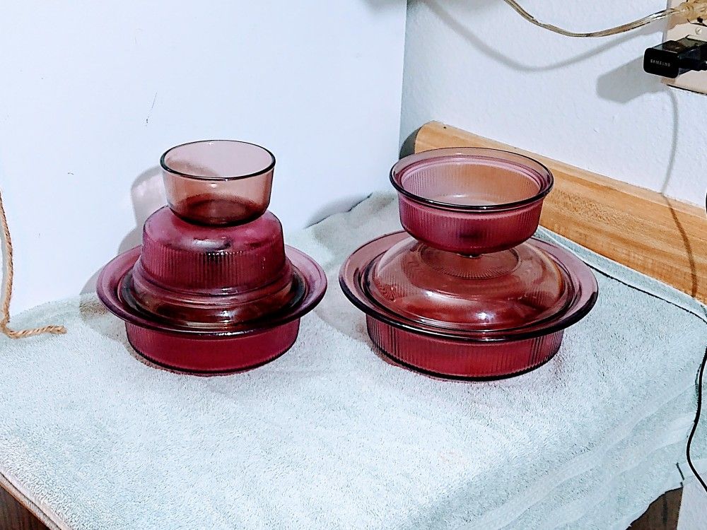 CRANBERRY VISION COOKWARE ( VISION ) 1) ROUND RIBBED V-31-B 1 Q T. LID INCLUDED. 1) ROUND RIBBED V-30-B 24 OZ. LID INCLUDED. 2) ROUND RIBBED C-16-B 1 PINT. 1) ROUND NOT RIBBED ONE CUP CRANBERRY BOWL PYREX. All pieces are free from chips and cracks.