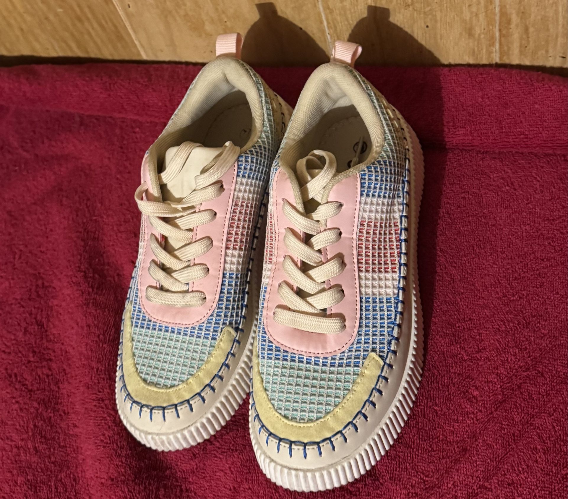 LA SHEELAH CROCHETED PATCHWORK INSPIRED MULTICOLOR FASHION SNEAKERS PRODUCT DETAILS: Lace up closure Platform bottom sole Heel Height: 2 in Size: 7 1/2