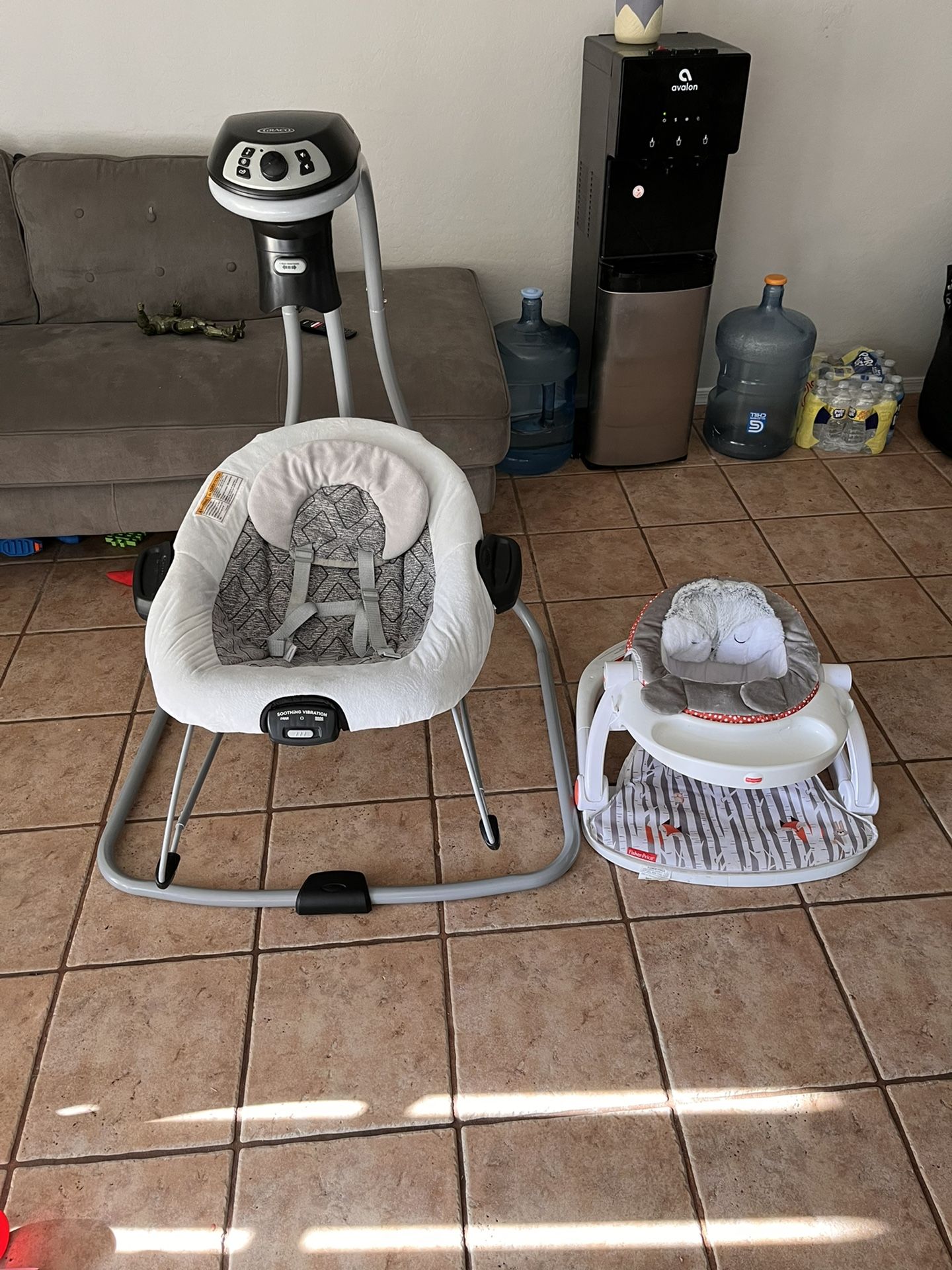 Baby swing and baby play chair with toy, barely used, like new