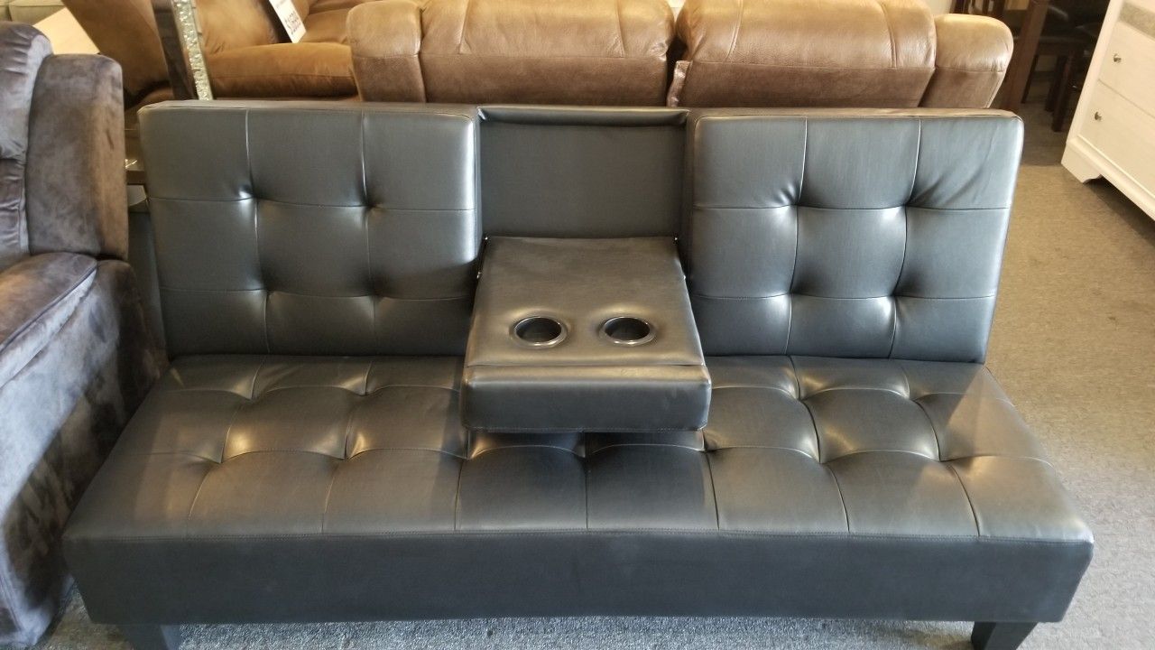Brand New 74" x 44" Black Faux Leather Sofa Futon With Cup Holders