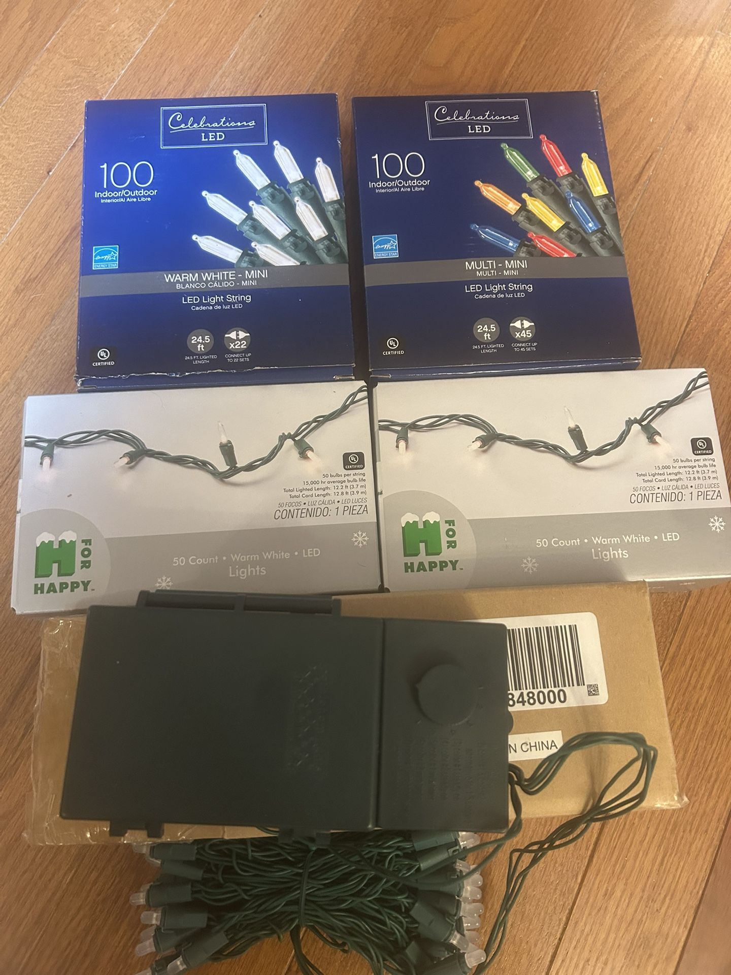 Lot of ~2500+ New & Used Lights for Holidays; Several Styles, Colors, and Type. All used lights are sold as is, are tested and working at time of posting, will be set up for testing at time of pick up, and are shown in working condition in pictures. The different lights included are shown in the pictures and include: ~200 Used Incandescent Clear Mini Bulbs ~100 Used LED Warm White Mini Bulbs ~ 500 Used Incandescent Multi-Color Mini Bulbs ~ 300 Used LED Red Mini Bulbs ~685 New Incandescent Clear Mini Bulbs ~200 New Incandescent 7 Mulit-Color Mini Bulbs ~100 New LED 7 Multi-Color Mini Bulbs ~200 New LED Warm White Mini Bulbs (4) New25 Watt Incandescent Red Standard Base Bulb (4) New 4.5 Watt LED Green Standard Base Bulb (23) New 5 Watt C7 Bulbs Assortment of Colors (13 Blue, 4 Orange, 3 Green, 1 Red, 2 Yellow) 1 New Manual Dial Set Outlet Timer