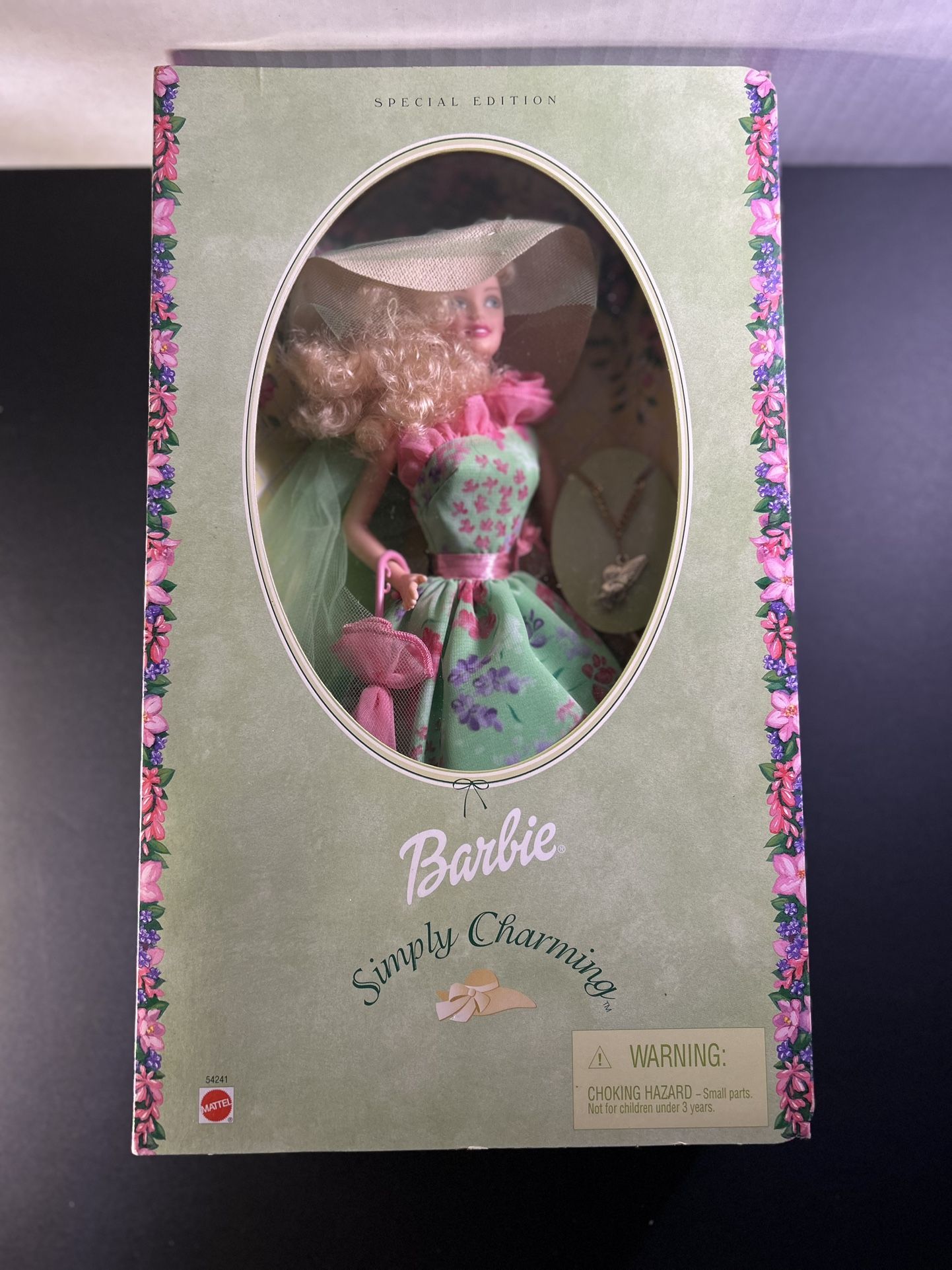 A beautiful Special Edition Simply Charming Barbie Doll from 2001 by Mattel (#54241). The doll is New, Never Removed From Box (NRFB) and is dressed in a lovely green and pink floral gown, complete with a large garden hat.