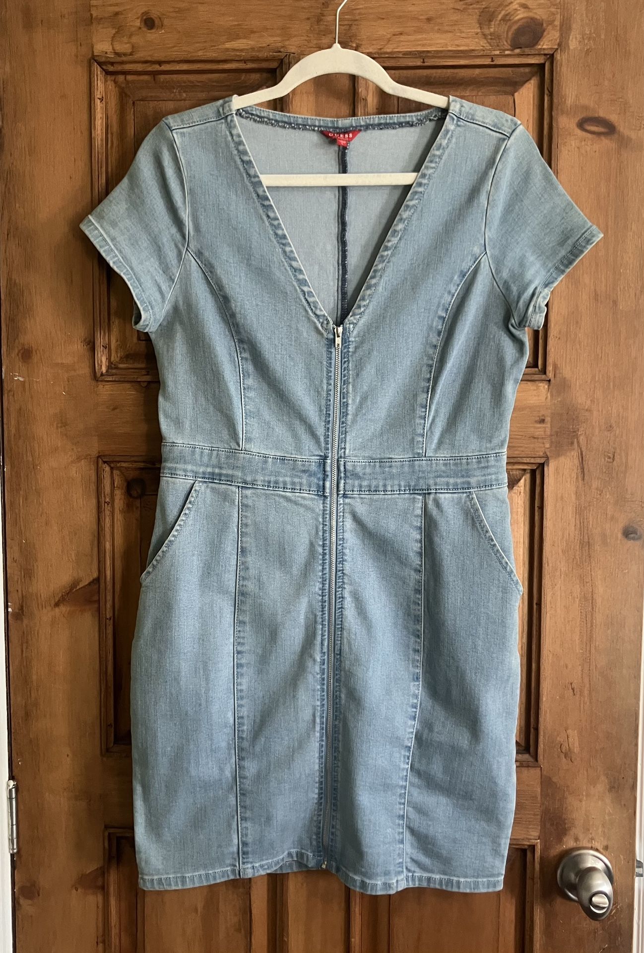 Woman’s denim mini dress with a V-neckline. Features short sleeves and front zip closure. Has super small and light spots, can barely see them. They are towards the bottom, check out last two photos. Comes from a smoke free home.
