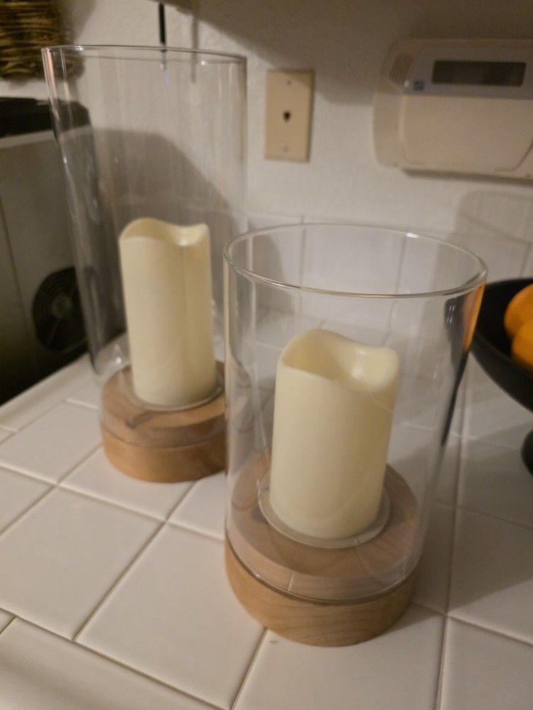 Gently Used. Set of 2. These Candles are battery operated and attached. Glass can be removed when needed. Great for decor, especially at the holidays! Fill with snow and mini ornaments at Xmas, or acorns/cranberries in the Fall. Perfect for mini eggs at Easter. Has timer setting, so they will come on daily!