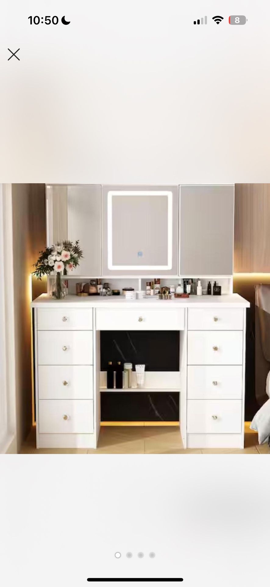 White vanity desk with drawers, shelf and mirror, never used White Modern Makeup Vanity Desk 9 Drawers Wood Dressing Table With 3 Mirrors, Hidden Storage Shelves, LED Lighted dm me for more information