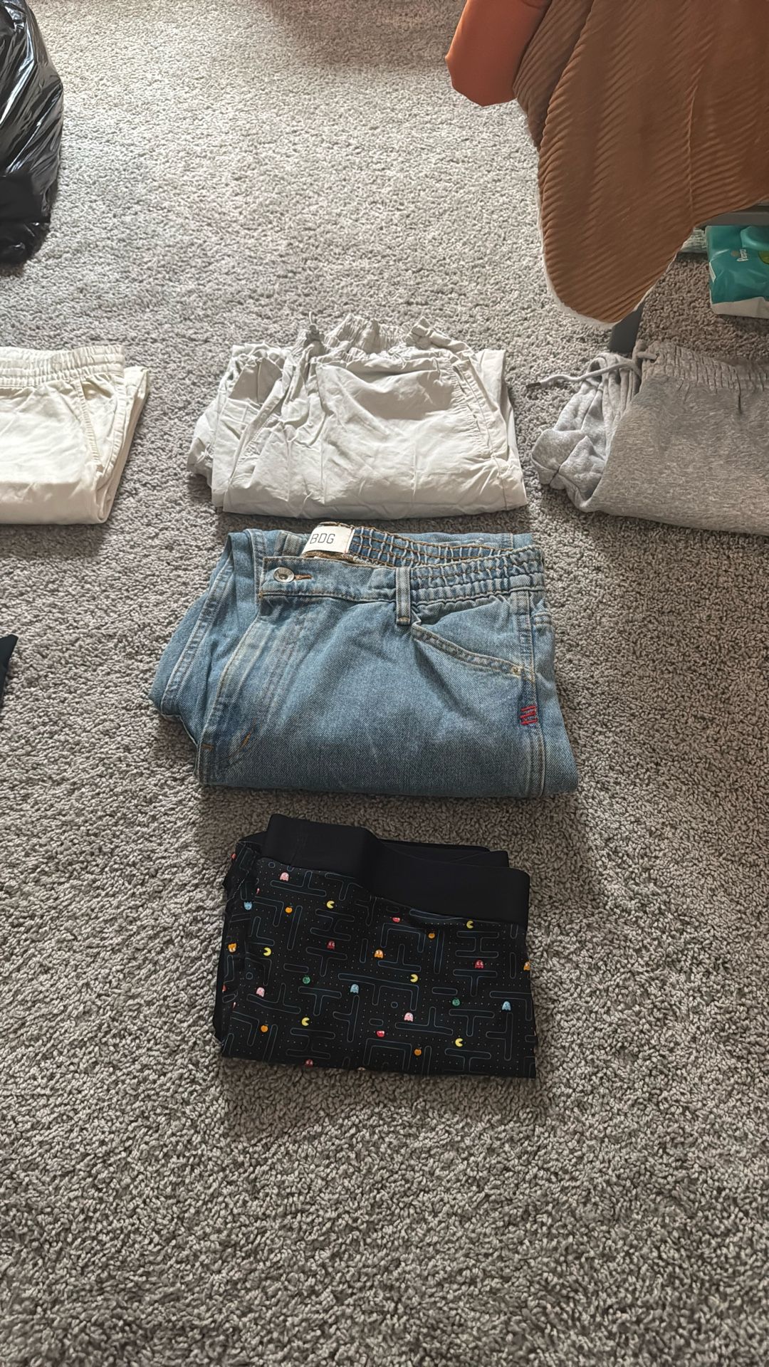 Men’s Large Clothing Lot – Jeans, Pants & New Boxers Bundle of men’s clothing in size Large. Includes: • 1 pair of BDG blue jeans • 1 pair of light-colored pants • 2 brand new boxers (Pac-Man print & solid color) – just taken out of the package All items are in great condition. Jeans and pants are gently used, while the boxers are brand new.