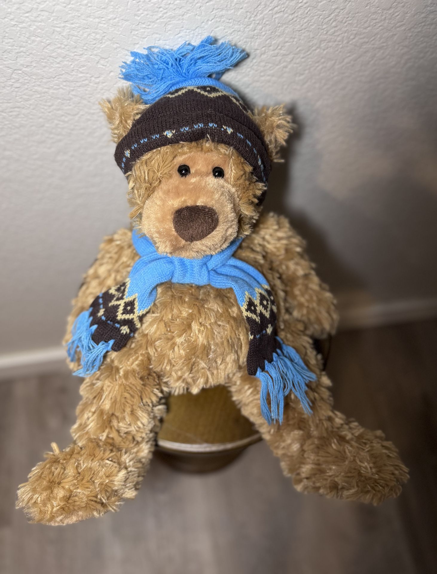 Soft Mary Meyer teddy bear! He features the signature textured "sherpa" style fur that the brand is famous for. He comes perfectly accessorized for the cold with a matching blue, brown, and tan knit beanie and scarf set. Around 35th Ave and Deer Valley