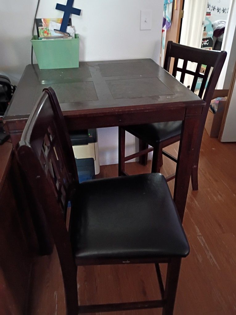 Two Great sturdy chairs ,tall kitchen/ dinning table, solid wood and stone does have wearing on the top otherwise good condition! Pick up near stone and wetmore
