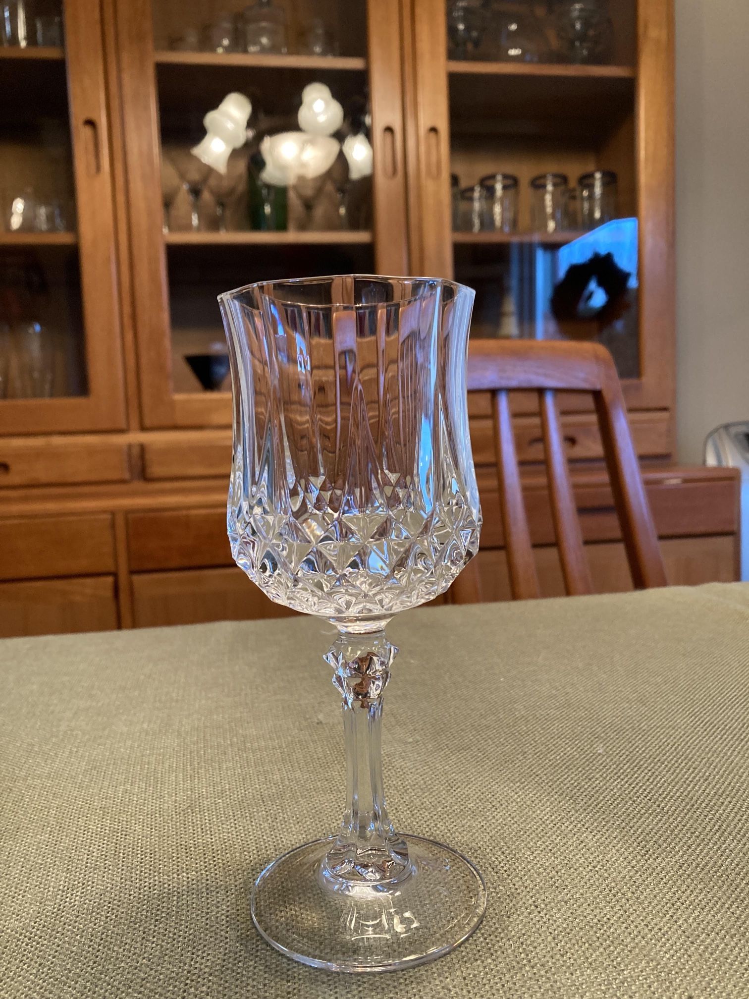 I have several pieces of Cristal d’Arques 24% Leaded Crystal for sale. The pattern is the Longchamp pattern. Made in France – it is hard to come by 24% Leaded Crystal anymore – excellent quality, and thick & heavy. Blown glass. This type of crystal dings when you flip it with a finger. Most all these pieces are new – many pieces are still in their original boxes. About the only things that have been used were some of the wine goblets and some of the tumblers and hi-ball glasses. We primarily had them on display in a large China hutch and cabinet. Realizing that no one will probably be interested in the entire collection, I have itemized the collection and priced each piece to sell individually. 1 – Water goblet. 7-1/4” x 2-3/4” [Note: I have 10 of these Water Goblets for sale.]