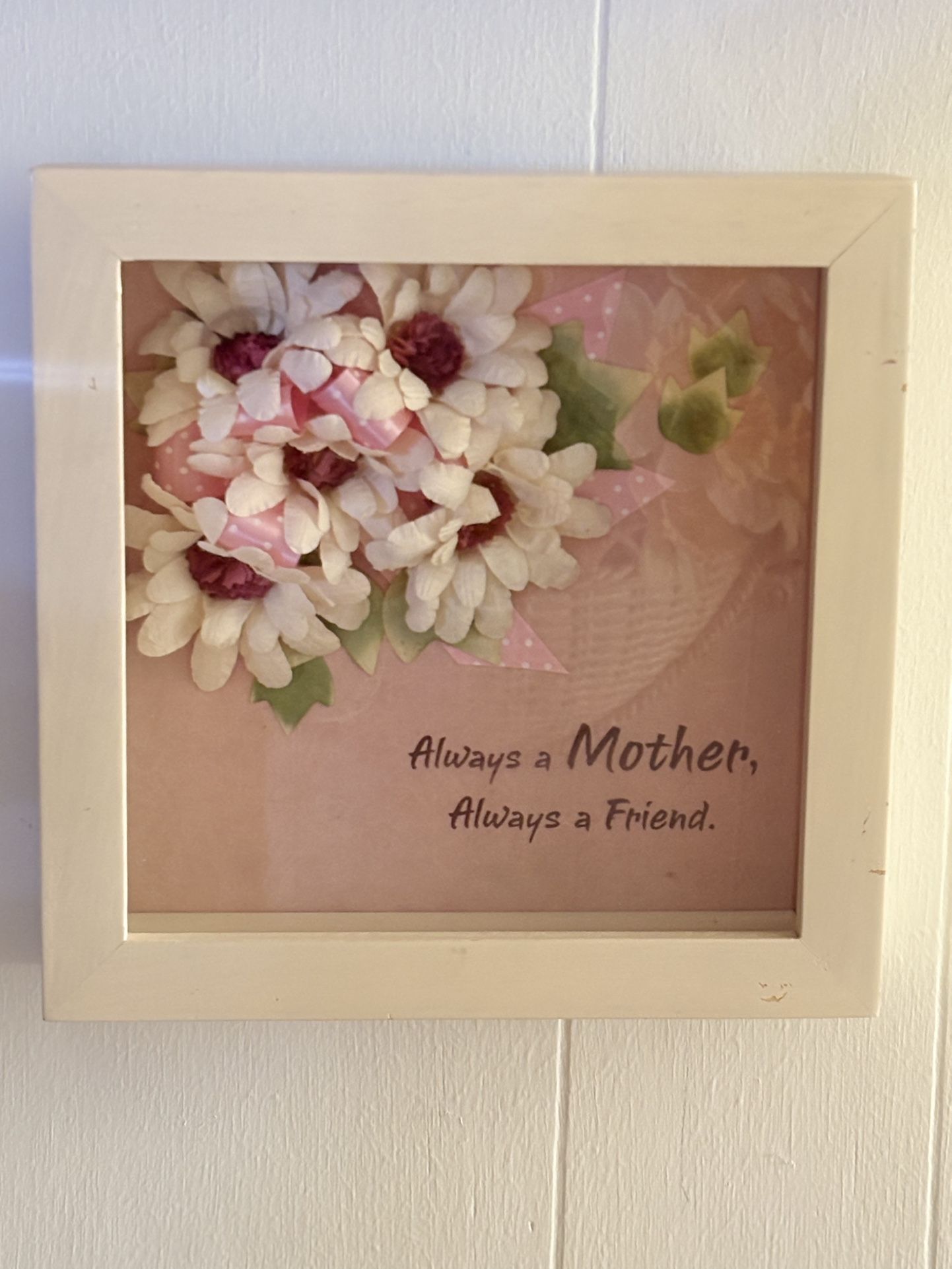Decorative wall art with flowers and 'Always a Mother, Always a Friend' text. 8.25” x 8.25” x 2”