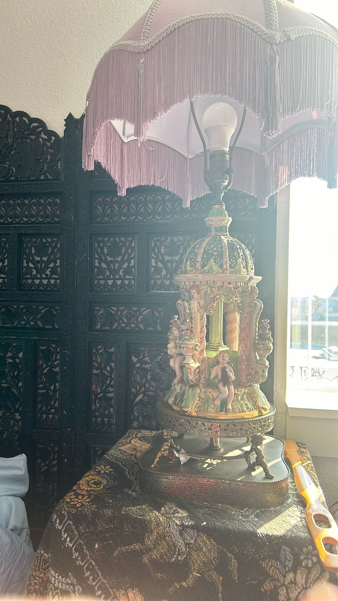 Identified by Google Lens: 10:23 96+ Ask about this image using AI This appears to be a vintage Italian Capodimonte porcelain lamp base with a Victorian-style velvet lampshade. • The lamp base is likely a 20th-century piece, possibly from the 1940s, featuring intricate designs and vibrant colors. • Capodimonte porcelain is known for its detailed craftsmanship and often depicts floral or cherub motifs. • The lampshade is a bell shape with a scalloped edge, fringe, and tassels, a classic Victorian style. • The combination offers a romantic, vintage ambiance. 20th Century Italian