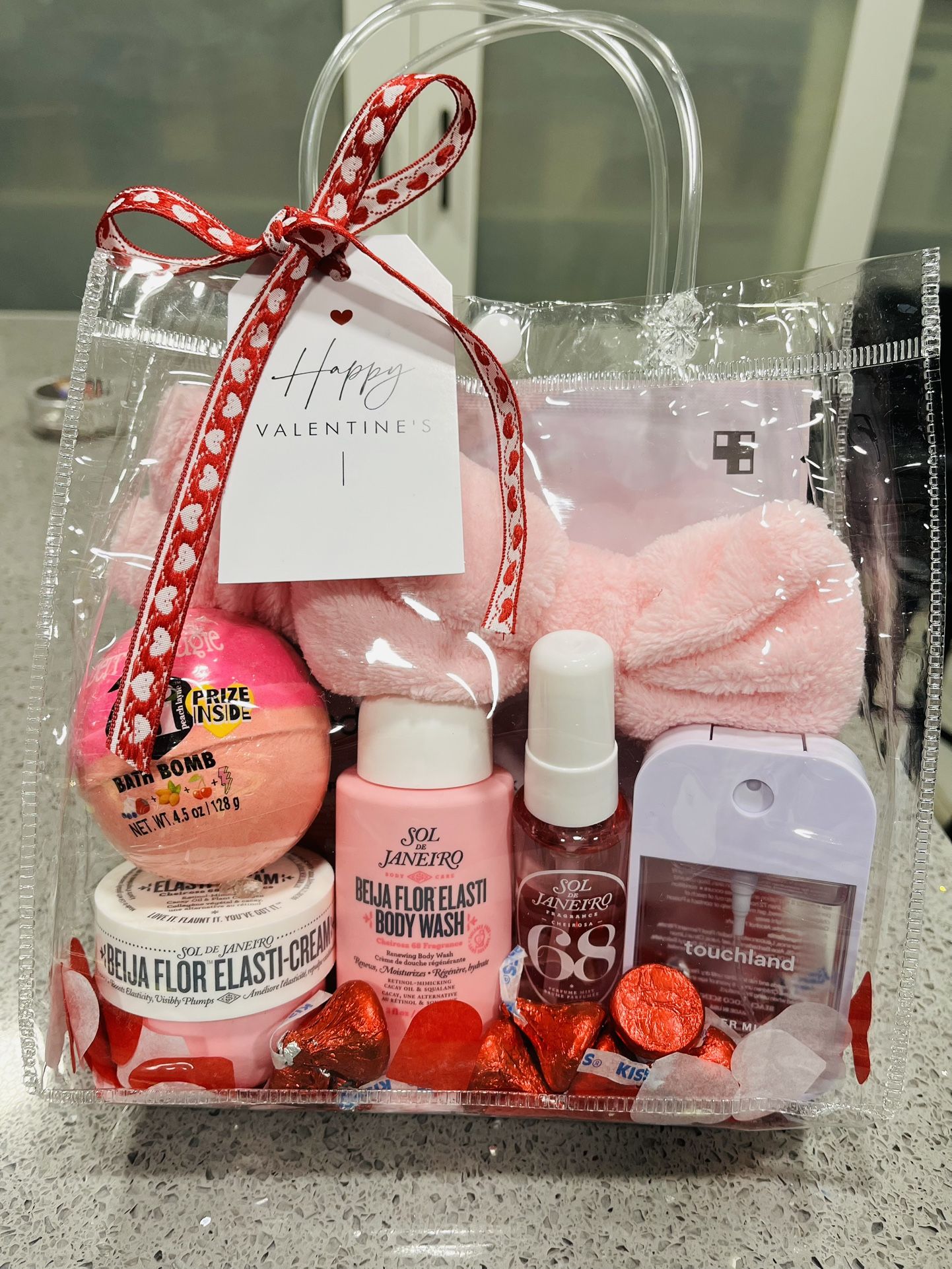 Valentines beauty bags, prices vary from $35-$50. Bags include sol de Janeiro mini sets of #68 and #62, touchland antibacterial mists, doce mini body cream, Hi bubble bath an bath bombs, La Soie face masks, Medicube face masks, head wraps, kiss red chocolates and valentines socks,