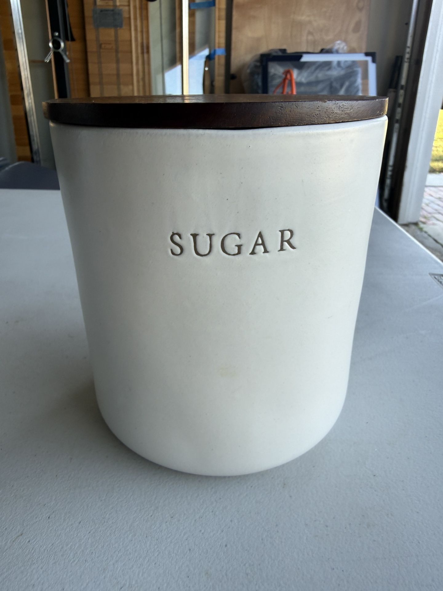 Hearth & Hand™ with Magnolia stoneware sugar canister with wood lid. Details: ✔ Heavy stoneware construction ✔ Solid wood lid ✔ Neutral farmhouse / modern kitchen style ✔ “Sugar” lettering on front ✔ From Target’s Magnolia collection Condition: • Clean interior • No cracks or chips • Light normal wear • Lid fits properly • Marked on bottom (see photo) Great for kitchen storage, coffee bar setup, or farmhouse décor. Pickup only. Cash preferred.