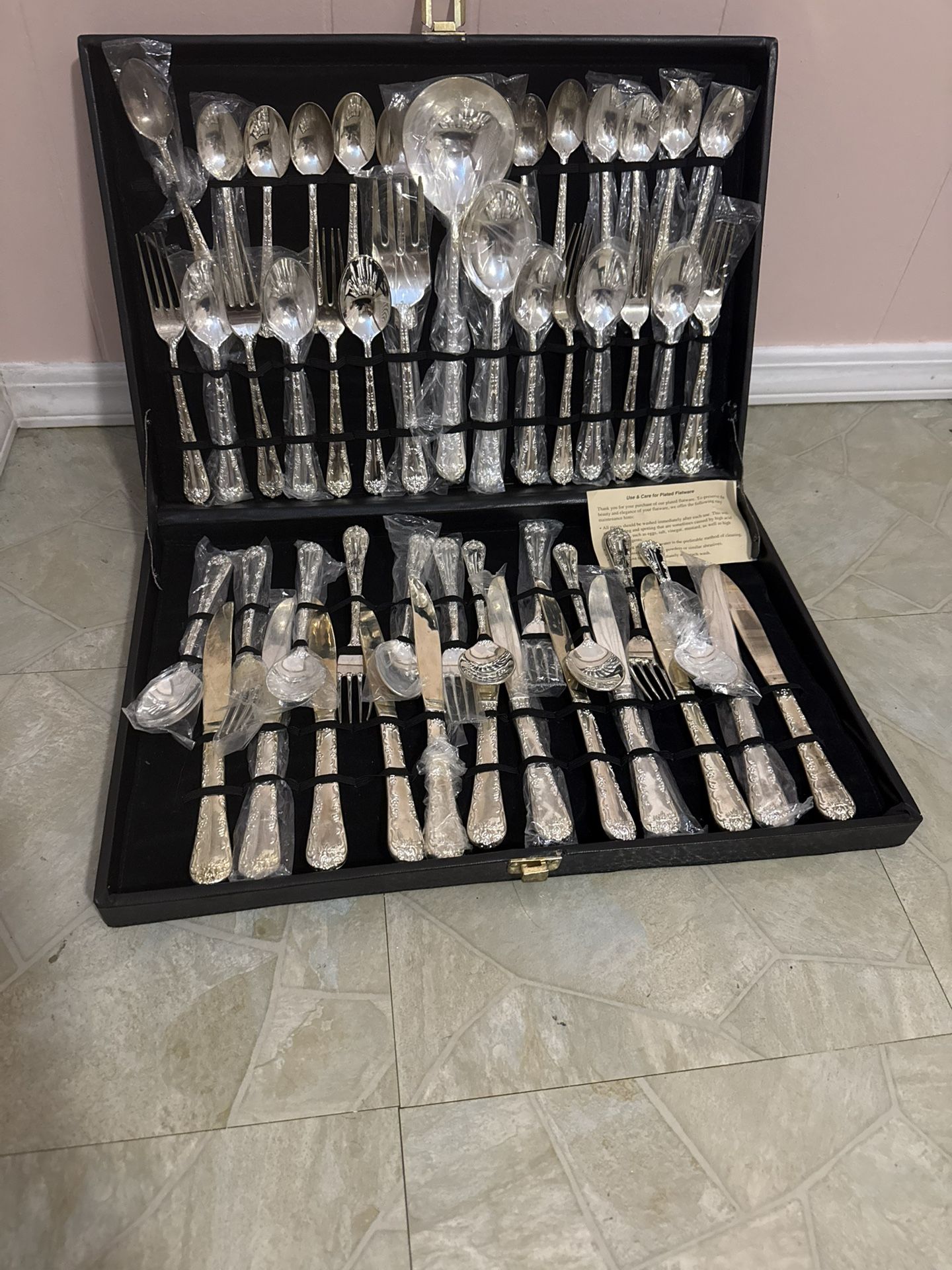 Service for 12 plus 3 piece serving set. 12 butter knives, 11 dinner forks, 12 soup spoons, 24 small spoons.