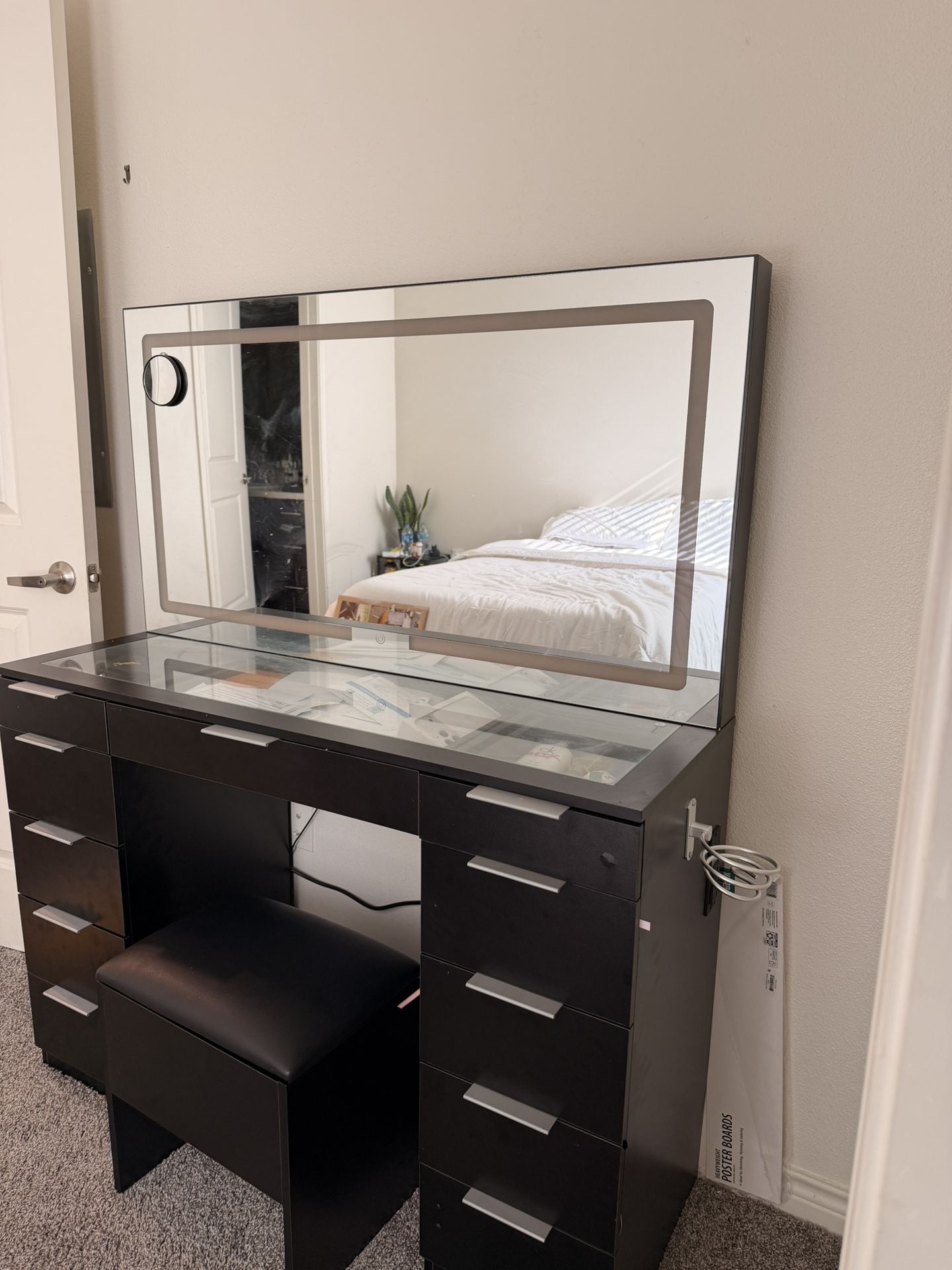 Black vanity table with large lighted mirror, glass top, multiple drawers, and matching stool. Excellent condition, very sturdy and stylish. Perfect for makeup, bedroom, or glam setup. Selling because Iβm moving. π² $250 OBO π Pickup only π΅ Cash / Zelle