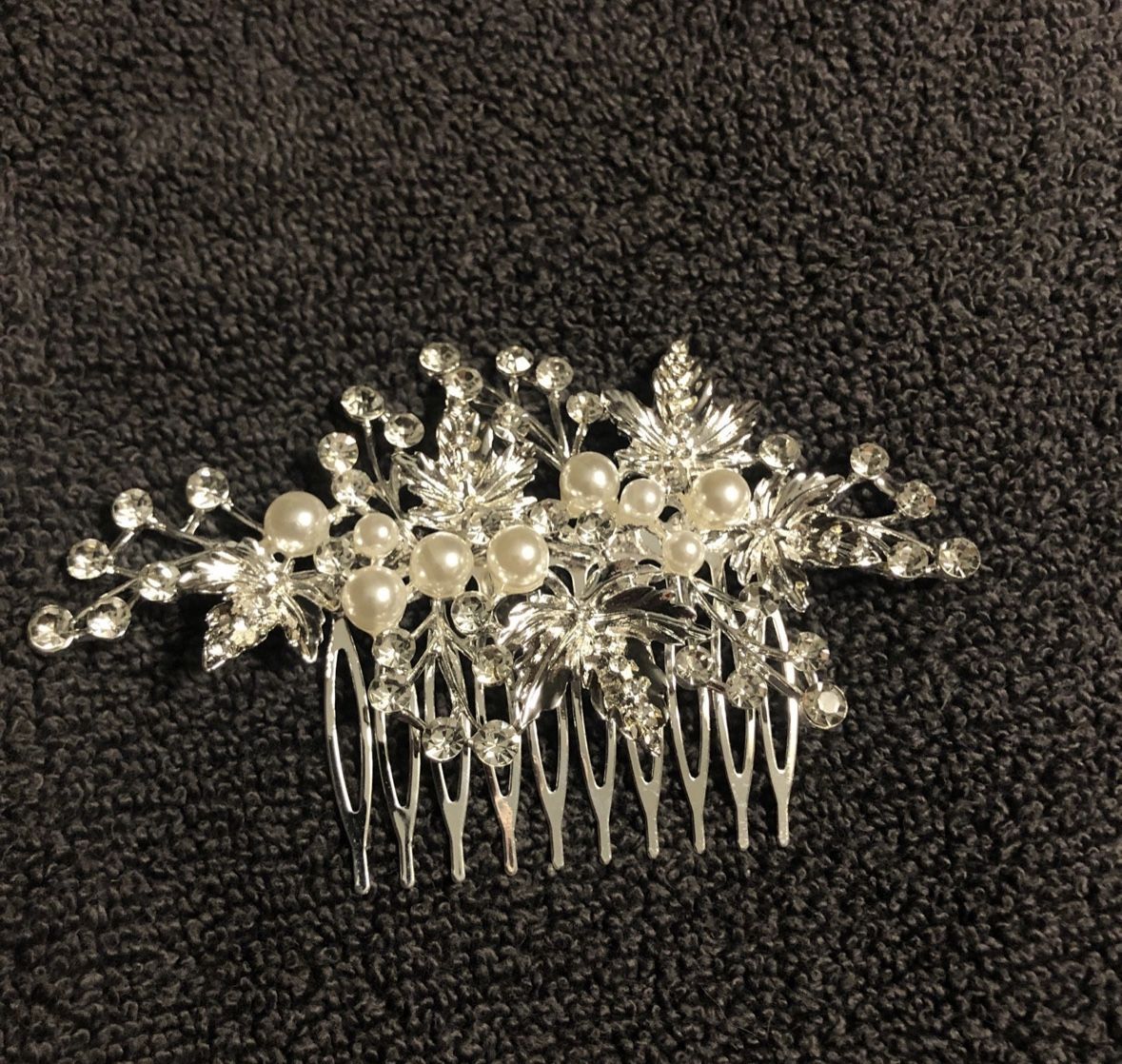 Wedding hair accessory Bridal hair comb Silver flower with leaves decorated with crystal rhinestones and simulated pearls. Beautiful hair piece. Perfect for many occasions. Wedding to prom dance or pageants. Perfect for the bride or mother of bride or maid of honor. Gorgeous and sparkles and shines. Will not disappoint. Can be worn for a variety of hair styles, whether you want to wear your hair up or or down. Wear in the back or style on the side. Great quality. View well made. Brand new- never worn or tried on- no tags. Approximately 4 inches long. View my other listings for opportunities to bundle. Reasonable offers always accepted.