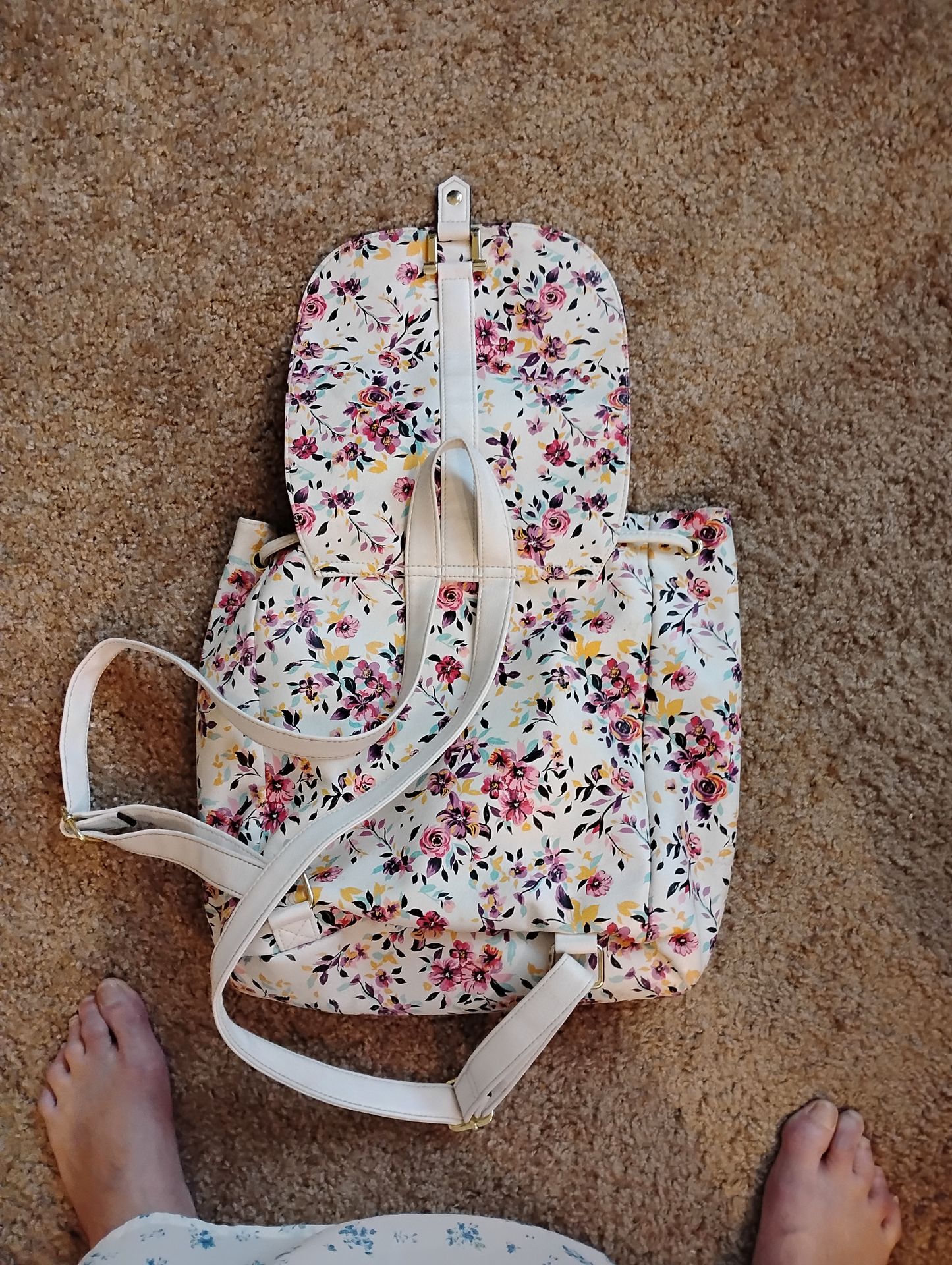 Medium size leather women's backpack, it has five pockets ,new, I've used it twice it's black on the inside with a flower print on the outside $20
