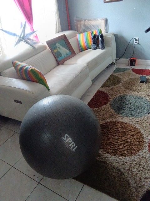 White couch ,glitter party sneaker,workout ball.