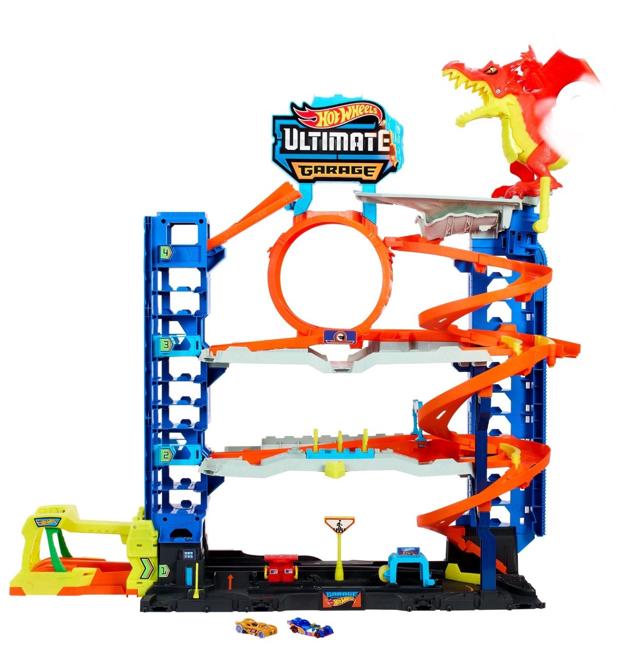 Hot Wheels City Ultimate Garage Playset, Storage for 50+ Cars Child Age 4-8, New in Box With the multi-level Hot Wheels City Ultimate Garage, kids can race, stunt and battle a dragon just like in the Netflix series 'Let's Race' The first floor features cool track-play details like moveable hoses, a car wash with a foam roller, diverters and connectors to connect to other sets as part of a larger Hot Wheels City. (Additional sets sold separately.) Take the two-car elevator to the next level where kids can launch the 2 included Hot Wheels cars straight from the elevator into a side-by-side race On the third level, launch into a side-by-side loop stunt, adjusting the diverters to change the cars' final destinations A car-hungry dragon awaits on the 4th level, and kids launch their Hot Wheels to defeat it or else get eaten. Eaten cars get 'pooped' out, while the defeated dragon plummets to the bottom of the garage Take advantage of the more than 50 parking spots for easy and convenient Hot Wheels storage The Hot Wheels City Ultimate Garage includes 2 Hot Wheels vehicles, making this a great gift for kids 5 years old and up
