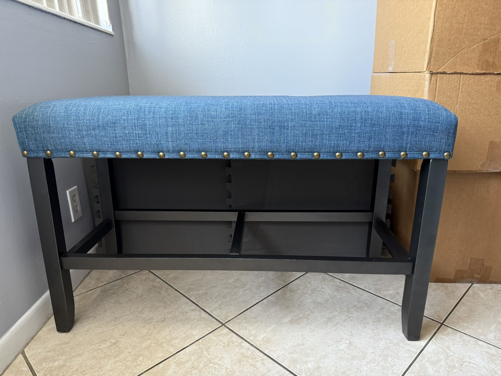 Color: Blue Legs: Dark brown Upholstered Entryway Bench, End of Bed Bench with Nailhead Trim, Indoor Bench Lightweight- not heavy at all Good condition. Clean- no stains Length 40” Height 24” Width 16”