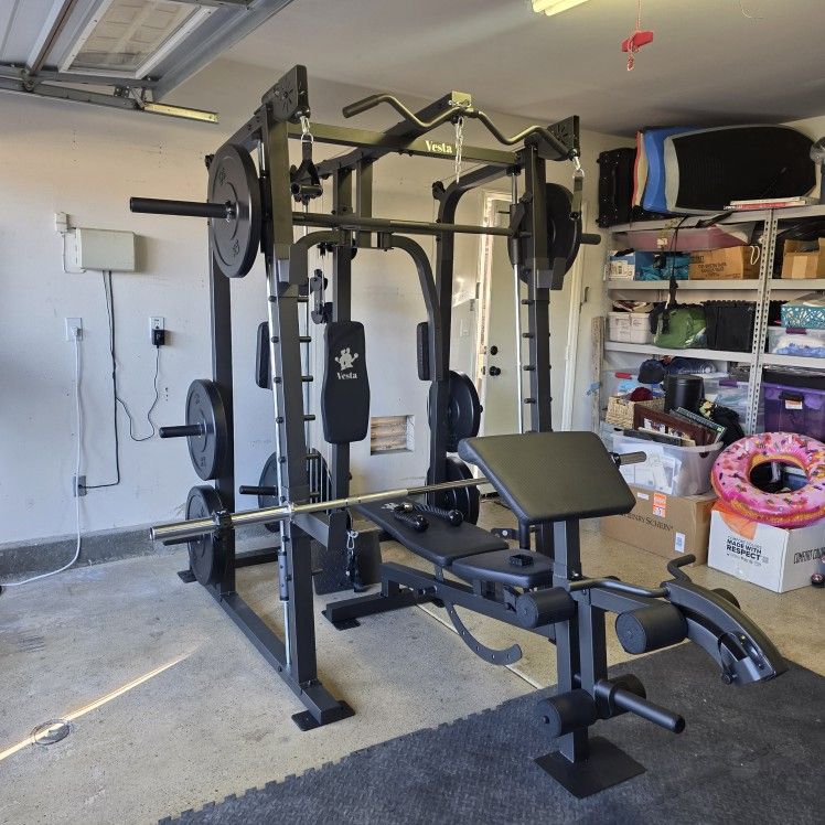 FREE DELIVERY 🚚 INSTALLATION AT EXTRA COST $$$ SHOWROOM AVAILABLE! NEW IN BOX! Need more photos let me know. Also have a Video available! 📷 《Offer only includes》 ✅️Vesta Smith Machine Sm2001 w all accessories and cable Attachments ✅️Multi-use Adjustable bench w/ leg workout station and precher station for biceps 💪 ‼️WEIGHTS AND EXTRA BARBELL ARE NOT INCLUDED ‼️ Vesta Sm2001 Smith Machine accessories and features ! Includes -- -- Hooks -- Spotter Arms -- 2 top side pulleys -- 1 Bottom back pulley -- 1 top center pulley -- Smith Barbell w/ saftey hooks! -- 2 D handles -- Ankle Strap -- Multi use Adjustable Bench with leg developer! Dimensions 86" Tall x 72" Wide x 83.5" Deep 🔴🔴🔴NEED BARBELL AND SET OF WEIGHTS 🔴🔴🔴 CHECK OUT THIS DEAL DOWN HERE! 🔥🔥$$$$$$1300 Bundle Deal 🔥🔥 ✅️Vesta Smith Machine SM2001 ✅️ Multi use Adjustable bench w/ leg developer ✅️230lbs Bumper Weights 45s/35s/25s/10s ✅️7Ft 45lbs Olympic Barbell w/ pair of clips! 🚛FREE DELIVERY 🚚 Intrested in more gym equipment shoot me a message! I can Help you Build Your Home Gym! Dumbells, kettle bells, more squat racks and Smith machines available