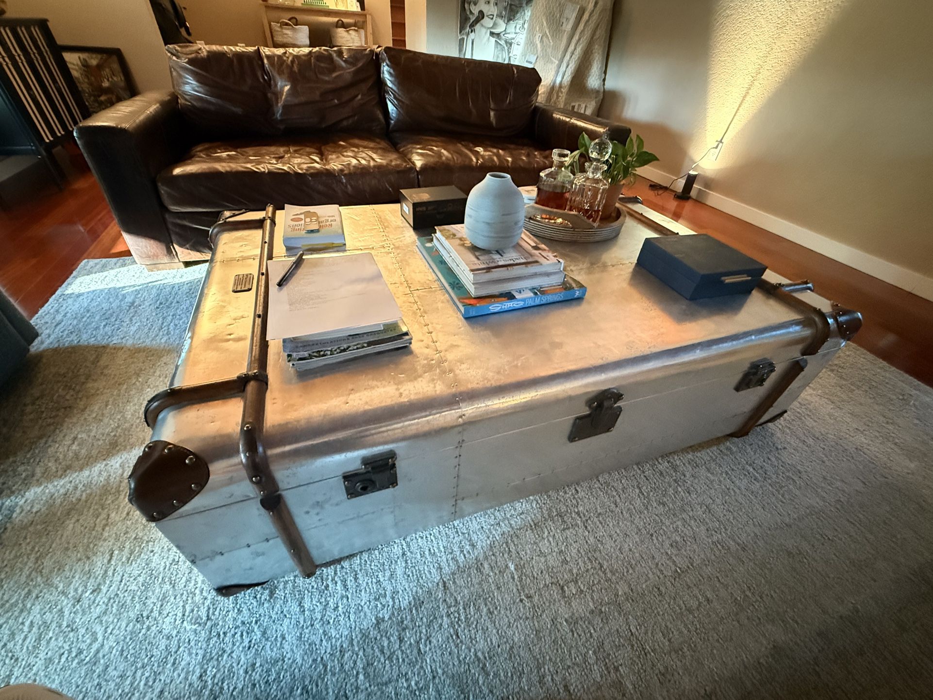 Bring timeless character and vintage-inspired design into your living space with this Restoration Hardware Richards’ Trunk Coffee Table. This discontinued piece is highly sought after and rarely comes up for resale. Handcrafted to mirror early 20th-century travel trunks, the table features: • Polished aluminum cladding with a lightly distressed, matte finish • Antiqued brass-trimmed solid wood bracing • Decorative leather handles and corner protectors • Brass luggage latches for an authentic vintage look • Canvas-lined interior with two hidden drawers for extra storage • Durable construction with unique character marks that add to its charm Dimensions: • 52½”W x 33¾”D x 17”H • Drawer interior (2): 17”W x 21¾”D x 7”H Originally sold exclusively at Restoration Hardware and now discontinued, this trunk coffee table is both functional and a statement piece for any living room. Condition: Excellent, gently used. 💰 Price: $800 📍 Local pickup in Mill Creek.