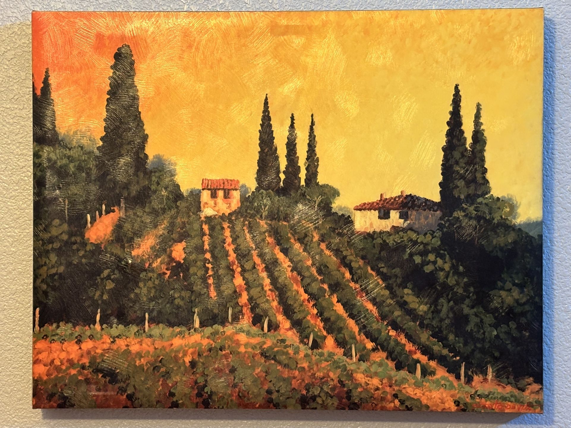 Experience the warmth and beauty of the Italian countryside with this stunning giclée print on canvas or archival paper. Capturing a serene vineyard scene with cypress trees and rustic buildings under a golden sky, this artwork brings a touch of Tuscany to any home or office. Artist: Eva Szorc Dimensions: 21" x 28" Medium: Giclée print on canvas or archival paper Theme: Tuscan landscape, vineyard, countryside Perfect for: Adding a vibrant, peaceful accent to your living room, dining area, or study. Bring the feeling of a Tuscan sunset into your space.
