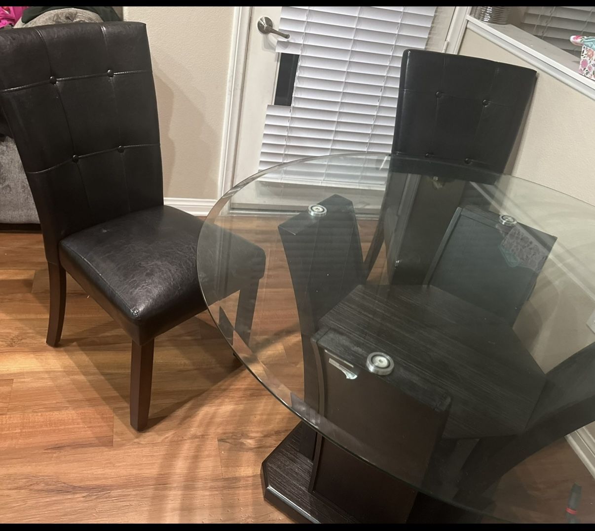 Selling my modern round glass dining table with four faux-leather chairs. Two chairs are fully assembled and in great condition, and two chairs are still brand new in the box — never used. The glass top is thick, sturdy, and easy to clean. Perfect for apartments, breakfast nooks, or small dining spaces. ✨ Features: • Round tempered glass tabletop • Sturdy dark wood base • 4 chairs (2 assembled, 2 brand new in box) • Faux-leather seats, no rips or tears • Modern, easy-to-match style • Seats 4 comfortably Heads up: There are a couple of minor dings on the wood base (normal wear), but the table is solid and still presents nicely. I priced it with that in mind. 📍 Pickup in Rancho Cucamonga