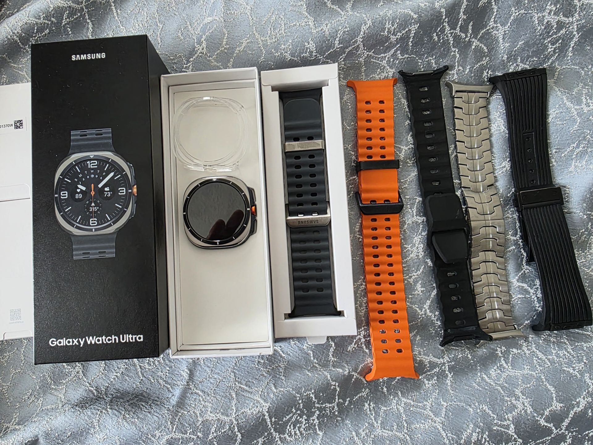 Galaxy watch ultra 32gb with 2 OEM bands gray and orange ($180 value) 1 titanium and 2 black silicon. Also included a clear frame protector.