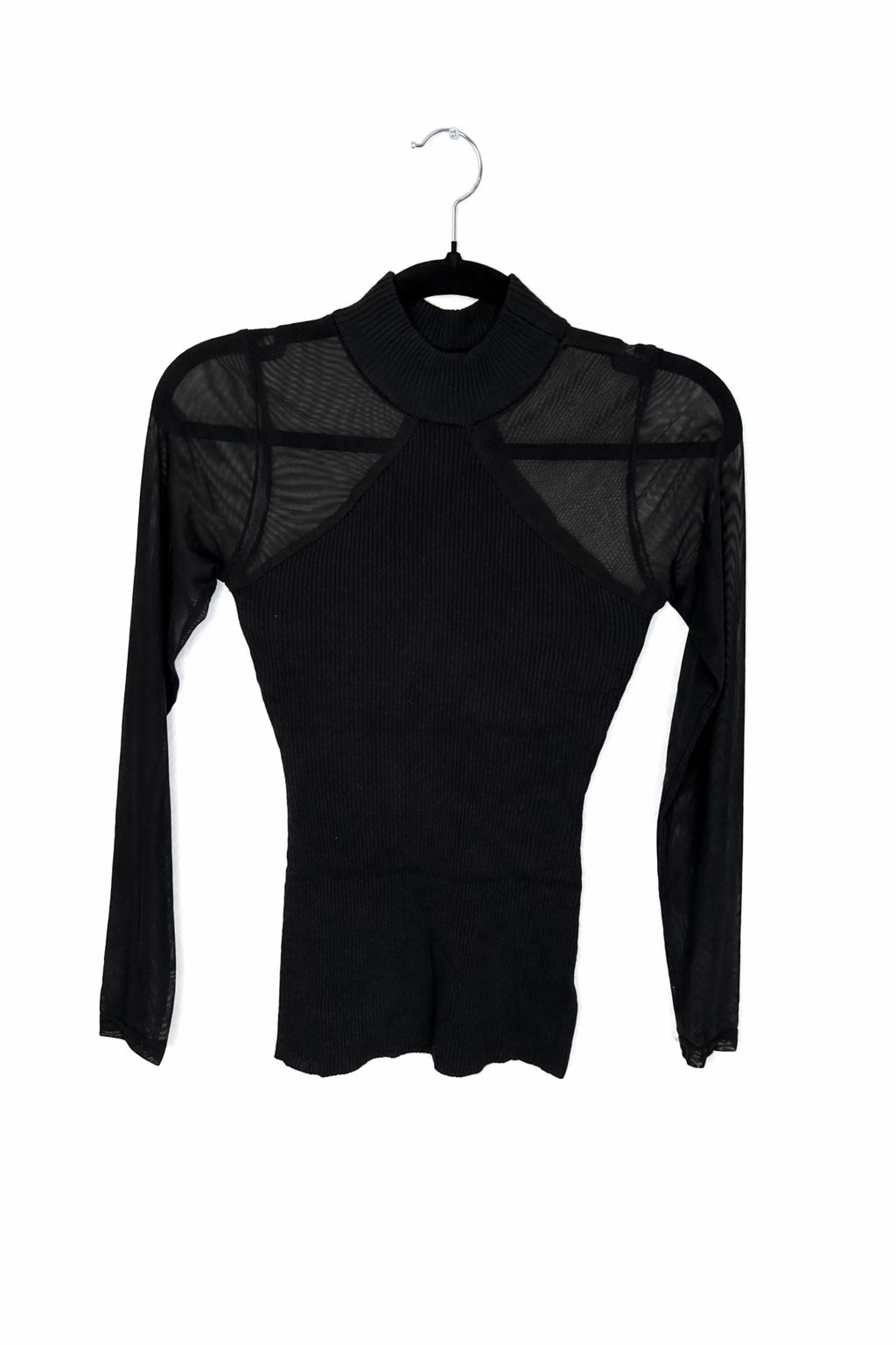 Sleek black long sleeve top featuring a mock neck and sheer mesh panels on the shoulders and sleeves. Fitted ribbed body creates a flattering silhouette while adding a modern, edgy touch. Perfect for night-out looks or elevating everyday outfits. Size: Small Price: $20 Payment methods: Zelle · Cash · Apple Pay Hashtags: #BlackTop #MeshDetails #MockNeckTop #ChicStyle #ShopSmall