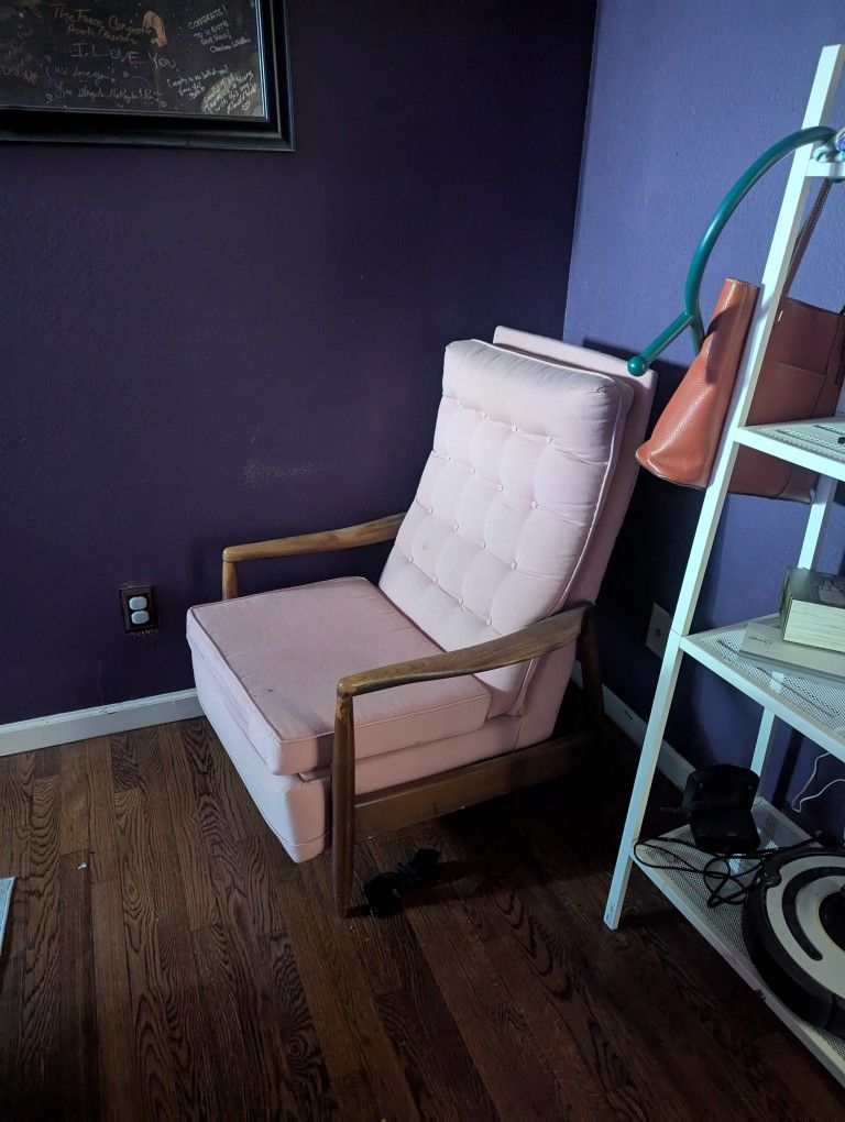 Id love to keep this family heirloom but there's just no room for it once our new furniture comes in. This is an old Milo Baughman recliner in pink. It needs to be sured up to mend it's wiggle from generations of use. In good condition considering its age, the fabric will need some attention. Also considering gold and silver for trade as I am learning to silversmith Mcm mid century modern recliner