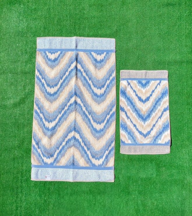 Excellent Used Condition (EUC), no rips, no holes, and no stains. 1980's By Design JC Penny Color Form Design and construction. 2 piece collection featuring: Blue and tan flame stitch design. 1 hand towel measuring 28" long and 16" wide. 1 body towel measuring 44" long and 27" wide. Thick pile absorbent construction. 7LFN2R2S