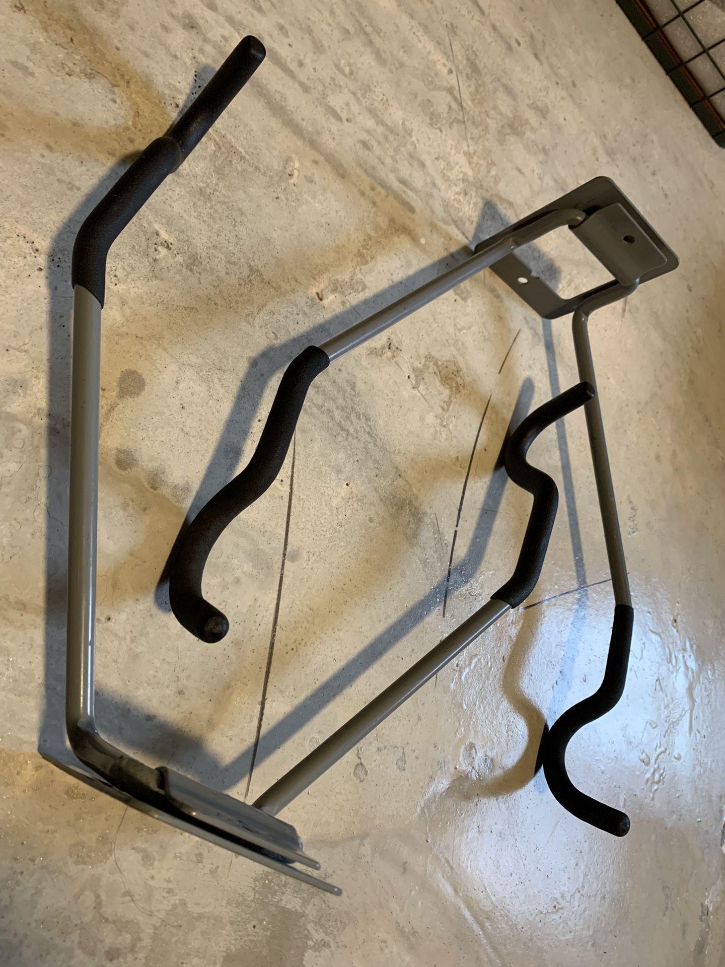 Set of 2 heavy-duty wall-mounted bike storage racks. • Steel construction • Rubber-coated hooks to protect bike frame • Wall mount design (mounting holes shown) • Great for garage or shed storage • Space-saving vertical storage solution Each rack securely holds one bike. Perfect for road bikes, mountain bikes, or hybrid bikes. Good condition. Ready to install. $25 for both. Reasonable offers welcome!