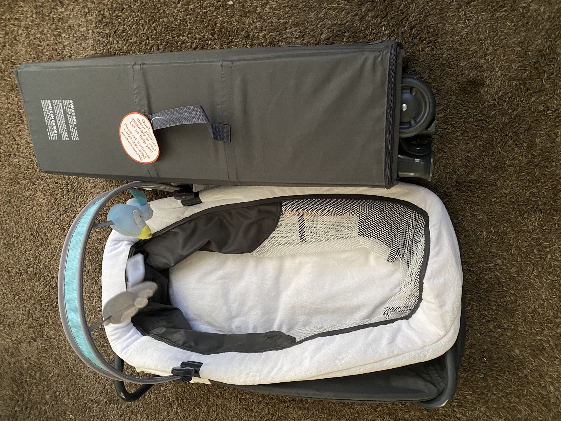 Used. Comes with bassinet and changing table. Also has pockets on the side. The mattress cover will need to be washed