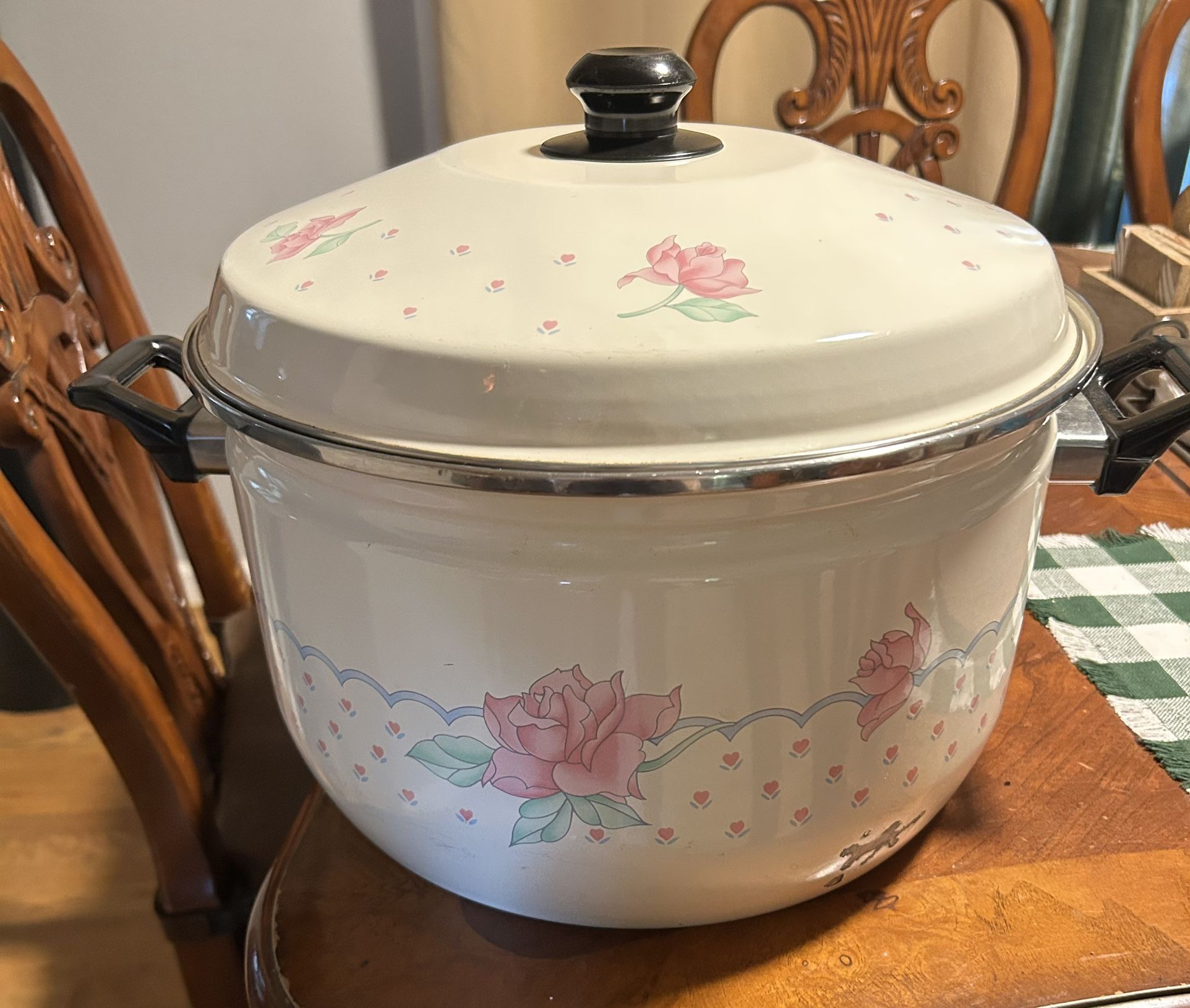 Large enamel stockpot has pink rose and heart pattern with blue scalloped border. This Tabletops Unlimited piece includes matching lid with black knob and two black side handles. Interior is cream colored with some minor wear marks. 9” deep 1’ft2” Wide from top Pick up in Brush Prarie Cash FCFS If it doesn’t say sold, it’s still available. I won’t respond if asked.