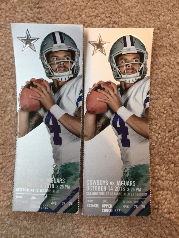 (2) Section 448 Row 26 - $95 each - aisle seats (4) Section 436 Row 22 - $95 each (4) Section 444 Row 20 - $135 each - facing 30 yard line (10) Section 441 Row 23/24 - $160 each - facing 30 yard line (4) Section 411 Row 25 - $150 each - facing 30 yard line (Cowboys' side) (2) Section 203 Row 3 - $250 each- Cowboys' side (5) Section 203 Row 11 - $300 each - Cowboys' side (3) Section 125 Row 12 - $300 each - actual 5th row up (2) Section C335 Row 3 - $400 each - 45 Yard Line - Face Value (4) Silver Lot 14 Parking Pass - $110 each (1) Silver Lot 13 Parking Pass - $125 each (1) Blue Lot 3 Parking Pass - $300 each - right next to stadium!