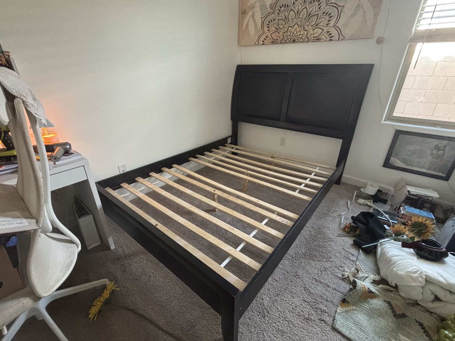 Used, taking up space in the garage while we pack, already collapsed down and ready to go Queen Sized Black Wood Bed frame Pick up Jackrabbit Trail or Litchfield