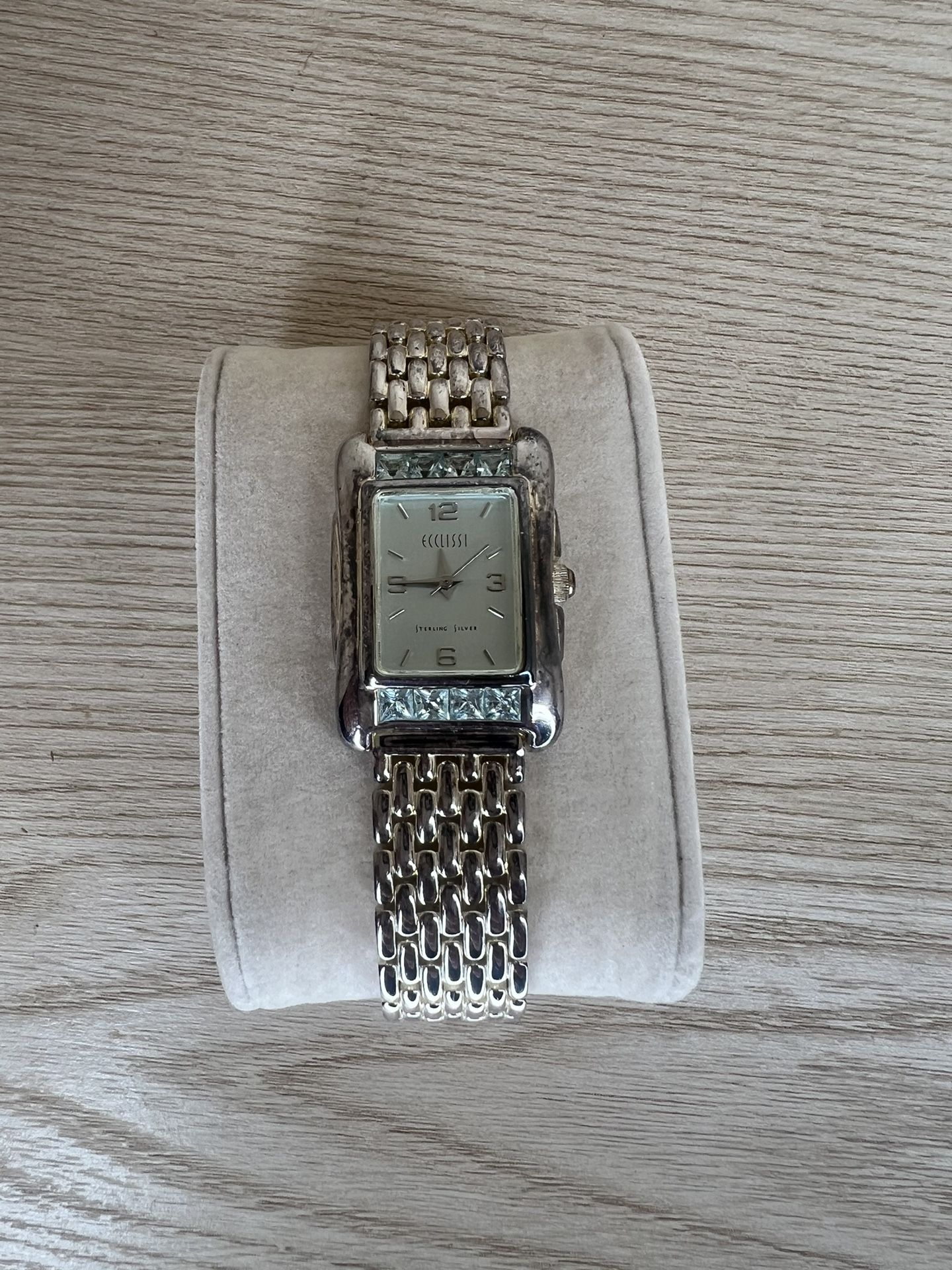 This elegant Ecclissi tank watch (model 32130) showcases a beautiful sterling silver case adorned with striking blue stones, creating a timeless piece that adds sophistication to any look. Known for its quality craftsmanship, Ecclissi combines luxury with functionality, making this watch perfect for collectors and fashion enthusiasts alike. • Brand: Ecclissi • Model: 32130 • Material: Sterling silver with blue stone accents • Style: Classic tank design A true statement piece, this Ecclissi watch is ideal for anyone who values refined elegance and unique design. Don’t miss the chance to own this luxurious timepiece!