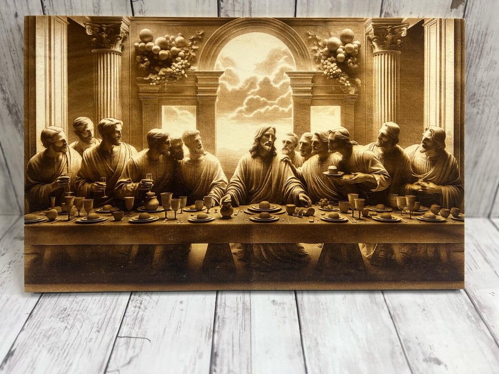 https://offerup.com/redirect/?o=aHR0cHM6Ly9vb3BzaWlua2VkLmNvbS9jb2xsZWN0aW9ucy9sYXNlci1lbmdyYXZpbmc= This piece is an exquisite wood engraving of The Last Supper, masterfully crafted to showcase depth, texture, and a timeless sense of reverence. Each figure in the scene is intricately carved, capturing the expressions and gestures that bring this iconic biblical moment to life. The sepia tones created by the natural wood grain add warmth and authenticity, making this artwork not only a religious tribute but also a stunning decorative element. Perfect for homes, churches, or religious institutions, this artwork provides a meaningful focal point, ideal for wall mounting in dining areas, living rooms, or sanctuaries. Its craftsmanship, from the carved arches to the lifelike depiction of each figure, elevates any space, offering both spiritual significance and artistic value. Whether for personal devotion or as a conversation starter, this piece will enrich your environment with history, faith, and artistry. ***Each engrave is clear coated and ready to hang*** Size: 18" wide by 11 1/4" Tall