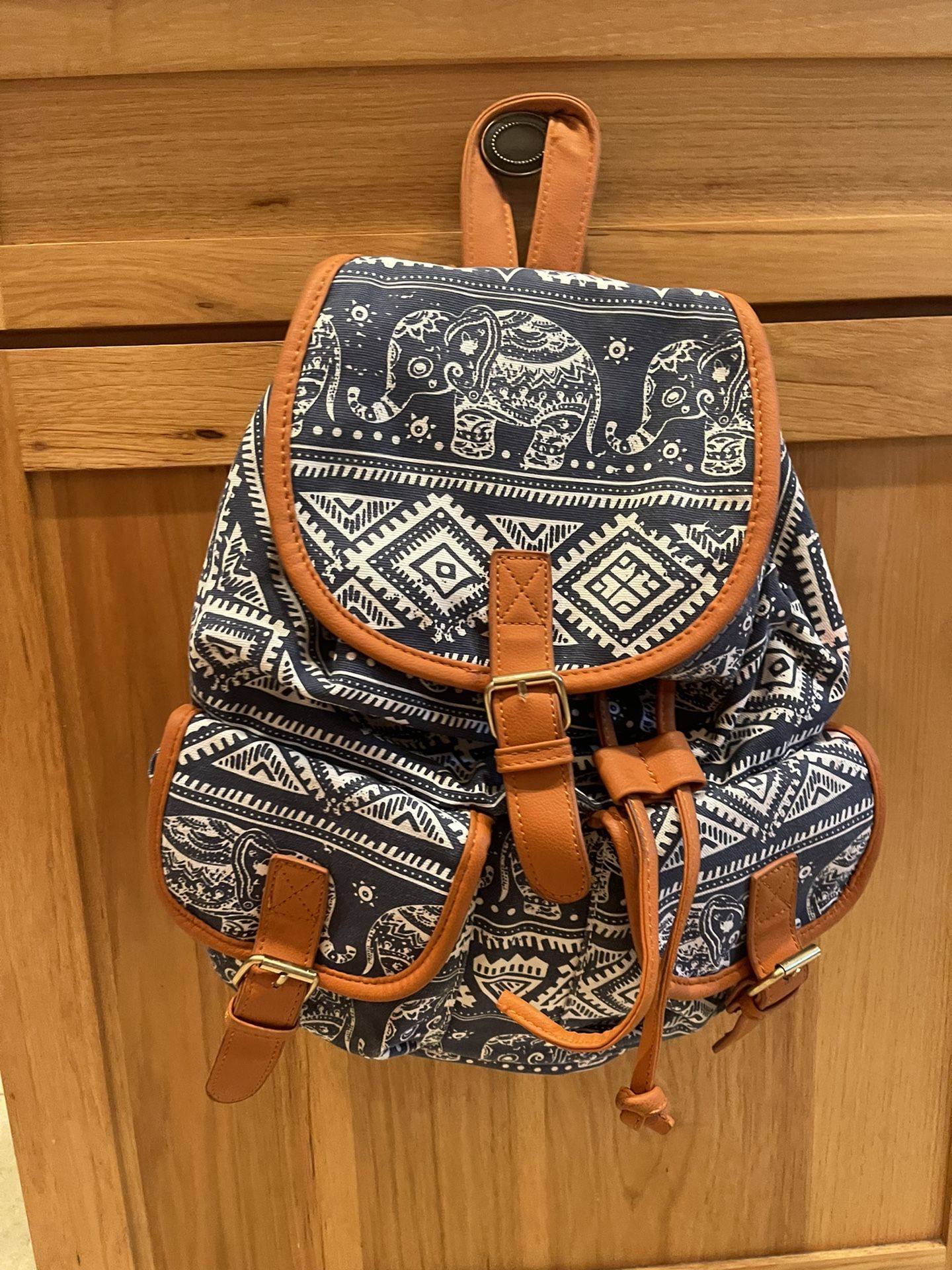 Navy and brown leather backpack. Medium size, brand new. Used 1 time. Excellent for back to school, airport travels or over night trip. Cute elephants and brown trim.
