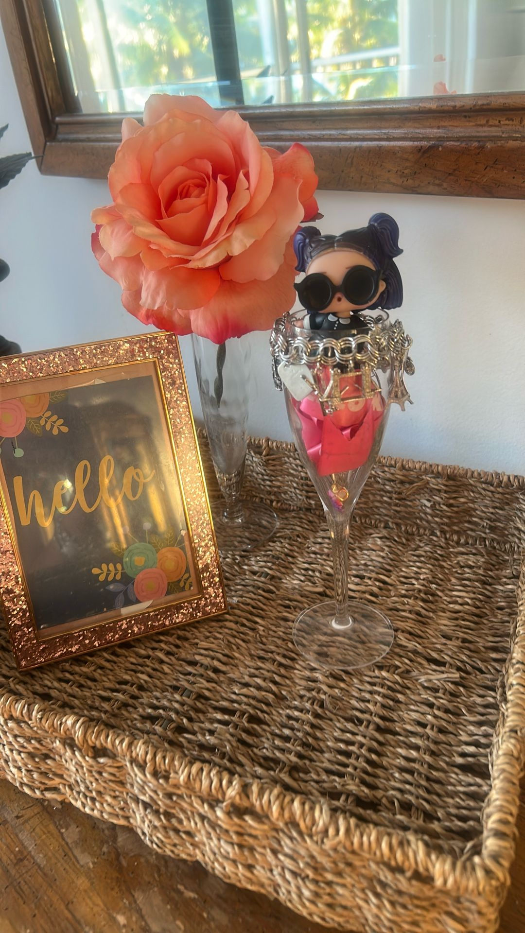 I make gift baskets. I’m a toy collector. I have every toy imaginable and can put together anything for you from adults to children all of your childhood toys that you can imagine from Marvel to Disney to Barbies. I have it all and can make anything along with jewelry gift card champagne, etc. this is a lol doll with a trolling silver bracelet inside a champagne cup. Very cute for the hello Kitty ribbon insideif you want a cup with the sterling bracelet and doll it would be $250.